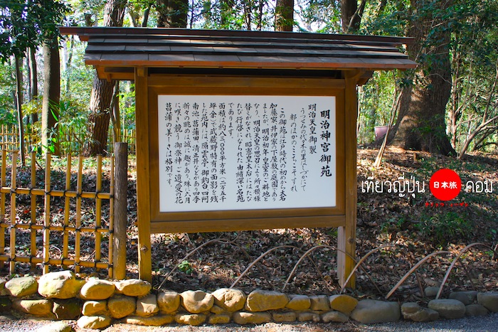 ด้านหน้าทางเข้า หลังจากผ่านประตูเสาโทริอิไม้ที่ตั้งอยู่ด้านหน้า มีป้ายบอกเล่าถึงประวัติของศาลเจ้า Meiji Jingu อย่างคร่าวๆ