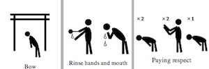 เมื่อถึงศาลเจ้า ต้องทำการแสดงความเคารพ 3 ขั้นตอน คือ 1.เมื่อเดินผ่านเสาโทริอิต้องก้มโค้ง 2.ล้างน้ำมือซ้ายและตามด้วยมือขวา บ้วนปากด้วยมือซ้าย ห้ามใช้ปากดื่มน้ำจากที่ตัก ล้างมือซ้ายอีกครั้ง ก่อนทำการล้างกระบวยตักน้ำ โดยให้น้ำไหลผ่านที่จับด้วย 3.เมื่อถึงอาคารศาลเจ้าหลัก โยนเหรียญ 1 ครั้ง ตามด้วยก้มโค้งคำนับอีก 2 ครั้ง ตบมือ 2 ครั้ง ขอพร และก้มโค้งอีก 1 ครั้ง เป็นอันเสร็จพิธี