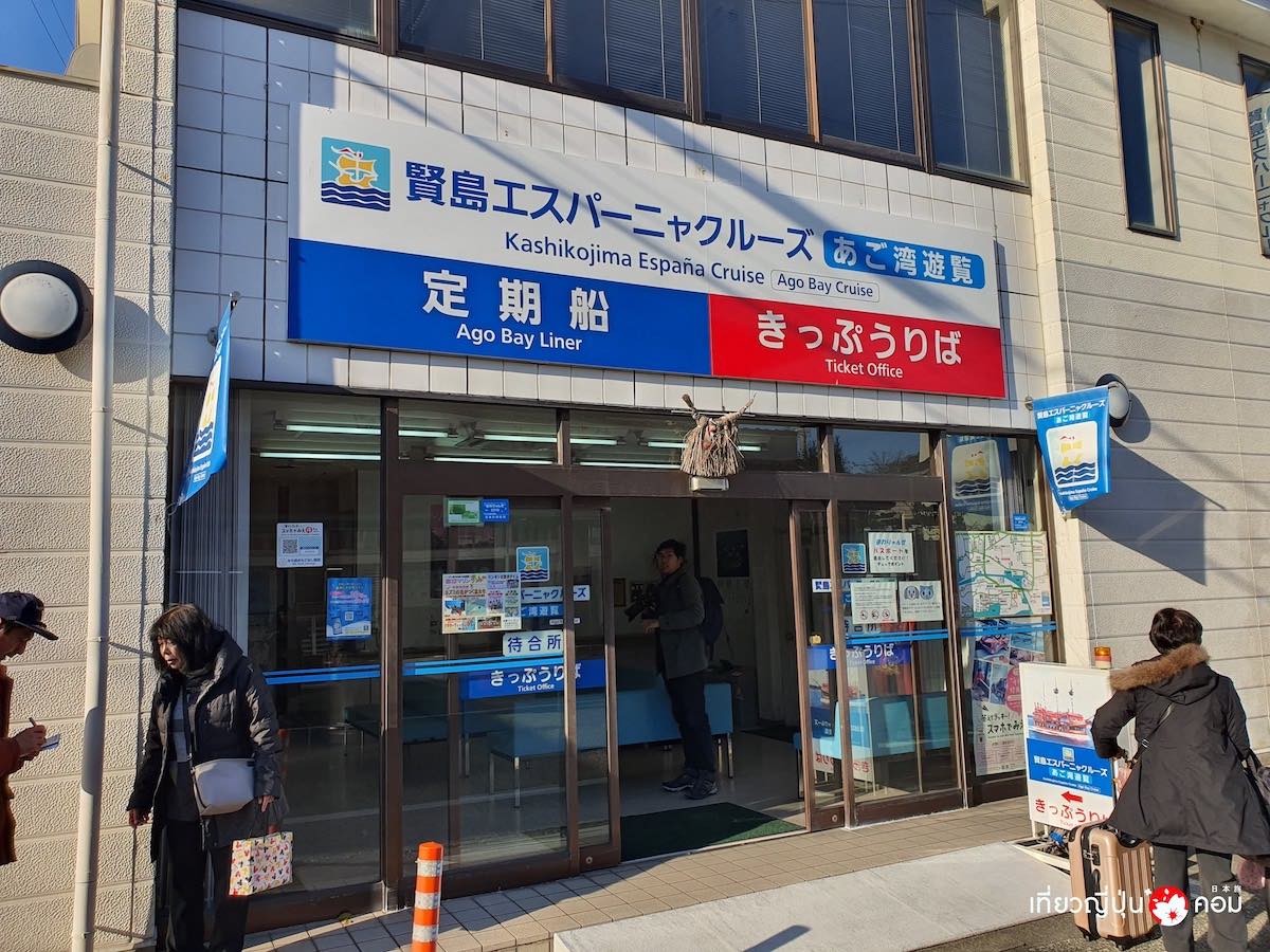 โดยสารรถไฟมาลงที่สถานี Kintetsu – Kashikojima สามารถซื้อตั๋วขึ้นเรือได้จากร้านสะดวกซื้อภายในสถานีรถไฟได้เลย หลังจากซื้อตั๋วเรียบร้อยก็เดินลงมาจากสถานีตามป้ายหรือจะมาซื้อตั๋วที่ออฟฟิศก็ได้