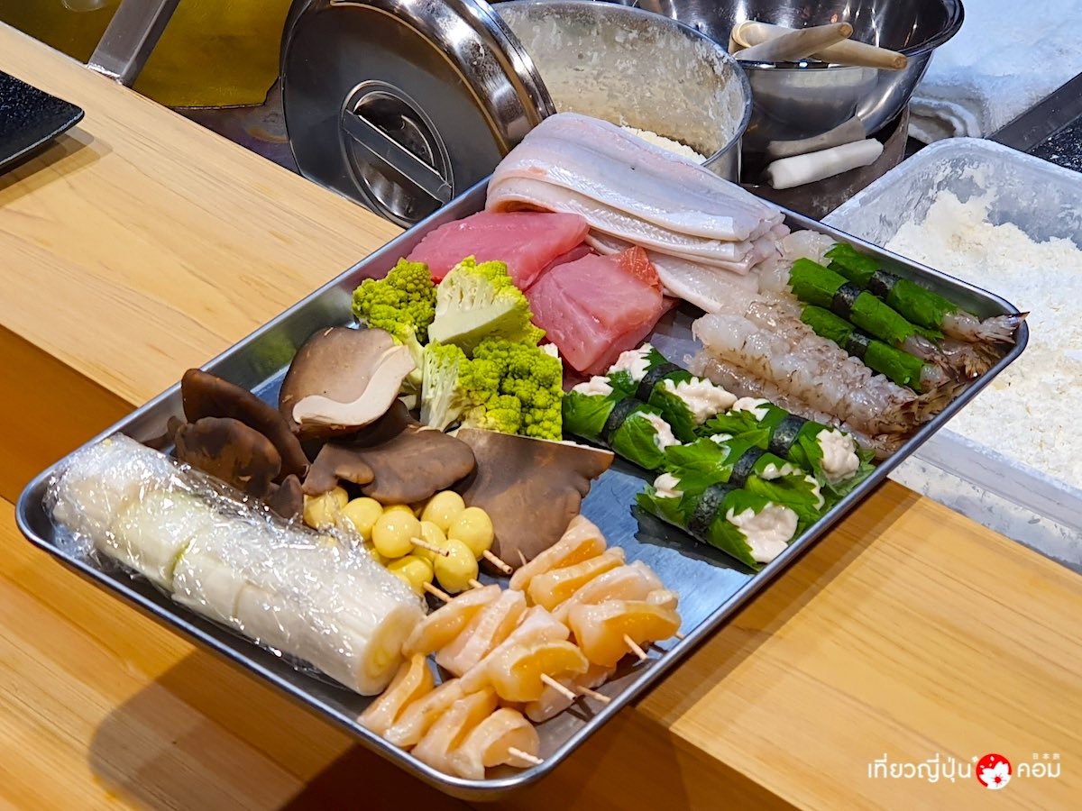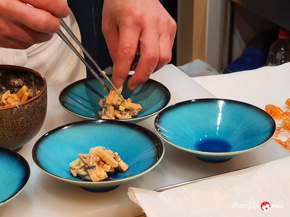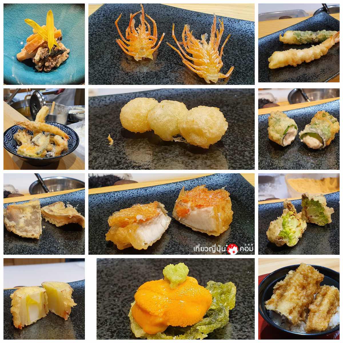 Main course: สลัดผัก / หัวกุ้งทอด / กุ้งคุรุมะ เอบิ พันด้วยใบโอบะ / เม็ดแปะก้วย / ไข่ปลาชิราโกะห่อด้วยใบโอบะทอด / เห็ดหอมอาวะบิ ชิตาเกะ / ปลาคินเมะได / เนื้อหอยมุก อะโกยะไก / ต้นหอม ชิโมะนิตะ เนงิ / ไข่หอยเม่นวางบนใบชิโอะทอด ราดด้วยน้ำมันเห็ดทรัพเฟิล / ข้าวหน้าปลาไหลเทมปุระ อะนะโกะ เทนด้ง เสริฟพร้อมผักดองและซุปมิโซะแดง / วาราบิโมจิ คลุกด้วยผงถั่วฮินาโกะ ราดด้วยซอสชาเขียว