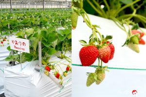 เช้านี้เราจะมาเก็บสตรอว์เบอร์รี่กันที่ ฟาร์ม Ichigo Kirari ซึ่งมีสายพันธุ์ให้เลือกมากถึง 8 สายพันธุ์ กิจกรรมนี้จะเริ่มตั้งแต่เดือนธันวาคมไปจนถึงต้นเดือนพฤษภาคม ในช่วงต้นฤดูกาลทางฟาร์มแนะนำเป็นพันธุ์ Kaorino ที่มีกลิ่นหอม หวาน และไม่มีรสชาติเปรี้ยวเลยแม้แต่น้อย ยังมีพันธุ์ Awayuki เป็นหนึ่งในพันธุ์สีขาวที่ค่อนข้างหายากเพราะติดเรื่องลิขสิทธิ์ ถึงจะเป็นสายพันธุ์สีขาวแต่ช่วงที่อร่อยที่สุดคือสีชมพูอ่อนทั้งลูก ส่วนสายพันธุ์ Amaou เป็นพันธุ์ขึ้นชื่อของจังหวัดฟุกุโอกะ จะเริ่มรับประทานได้ตั้งแต่ช่วงสัปดาห์ที่ 3 ของเดือนธันวาคม
