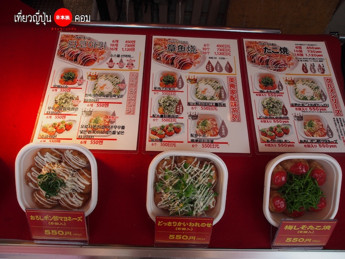 สำหรับเมนูของทาโกะยากินั้น มีหลากหลายหน้าและรสชาติ ราดซอสหลายรสแล้วแต่ชอบ ไม่ว่าจะเป็นหน้าต้นหอมซอยโปะไข่ลวกราดมายองเนส หรือจะเป็นซอสเปรี้ยว Ponsu และ ซอส Umeshiso เป็นต้น สนนราคา 6 ลูก 550 เยน