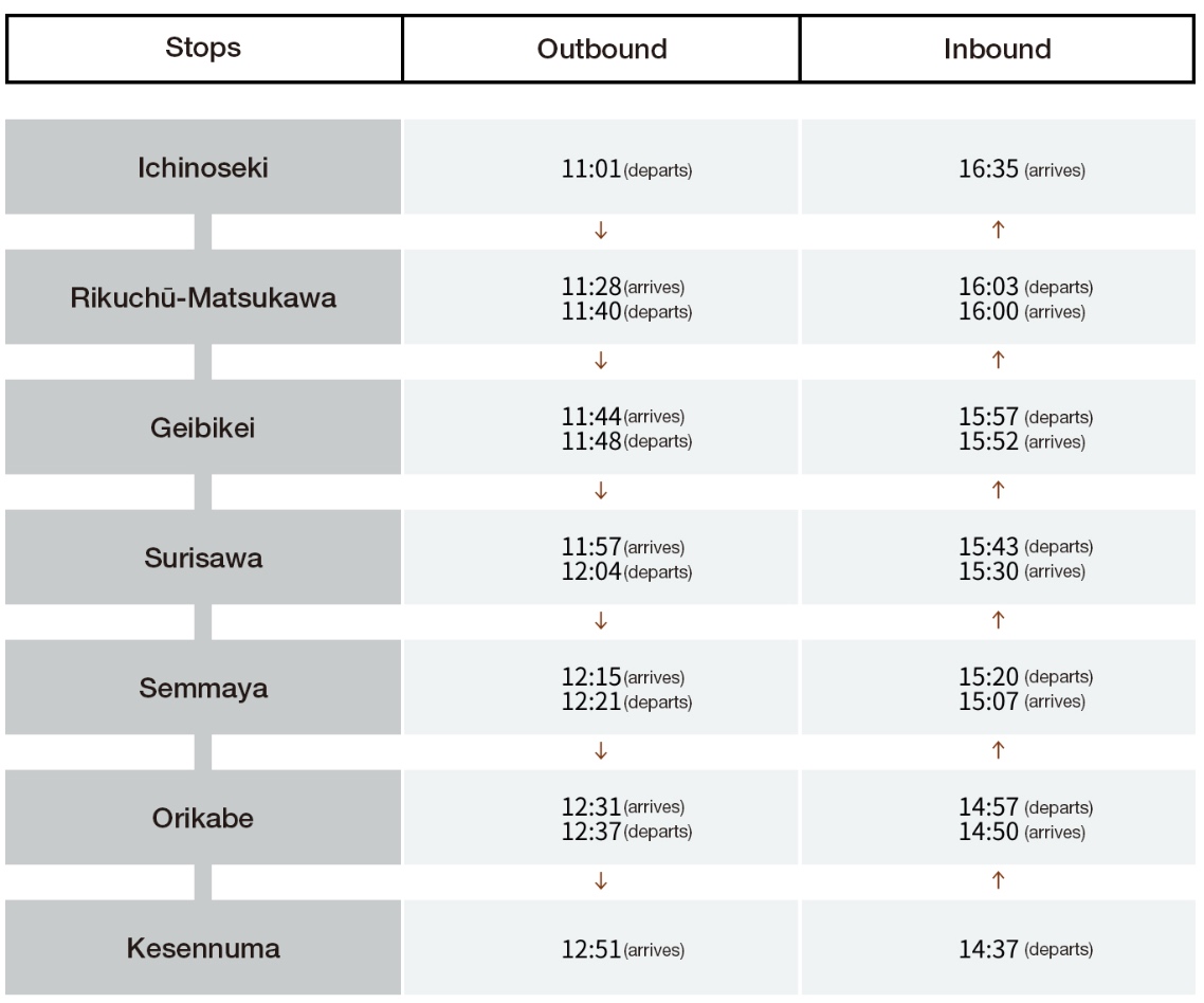 ขาไป: ออกจากสถานี Ichinoseki เวลา 11.01 น. เดินทางถึงสถานี Kesennuma เวลา 12.51 น.
