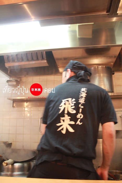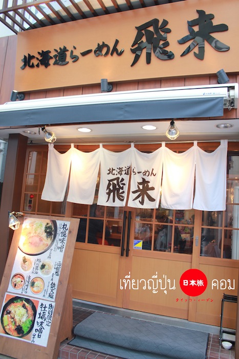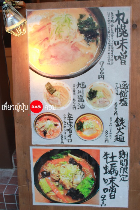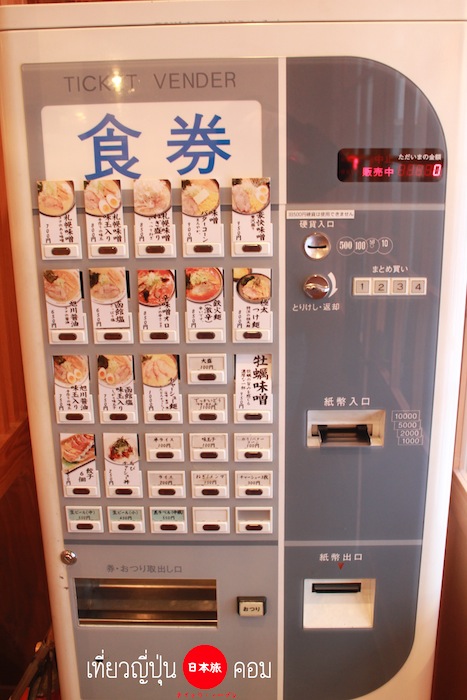 พอเข้าไปในร้านก็จะเจอตู้ขายตั๋วอัตโนมัติ เลือกรสที่ชอบ ร้านนี้อำนวยความสะดวกให้ ถึงแม้จะไม่มีภาษาอังกฤษแต่ก็มีรูปให้ เมนูหลักๆจะตั้งชื่อตามเมืองต่างๆในฮอกไกโด เช่น Sapporo Miso เป็นน้ำซุปมิโซะ ราคา 700 เยน Asahikawa Shoyu เป็นน้ำซุบโชยุ ราคา 650 เยน และ Hakodate Shio เป็นซุปรสเกลือราคา 650 เยน สามารถเพิ่มไข่อีก 100 เยน ได้ตามต้องการ