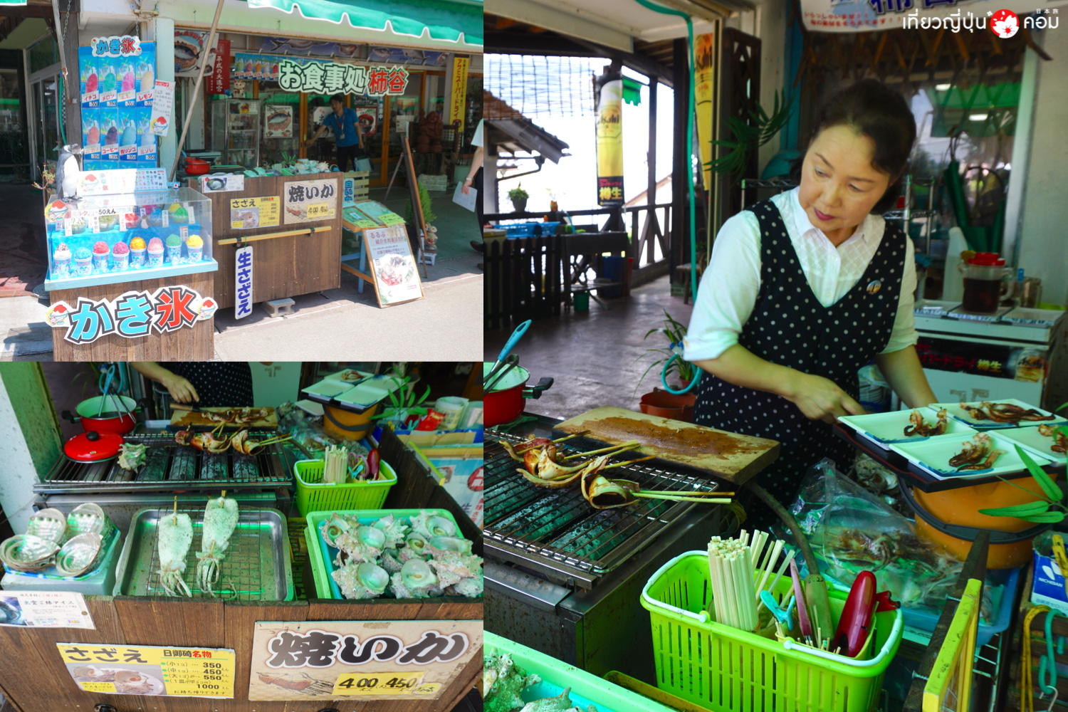 คุณป้าเจ้าของร้านกำลังย่างปลาหมึกและหอยทะเลสดๆให้ชิม