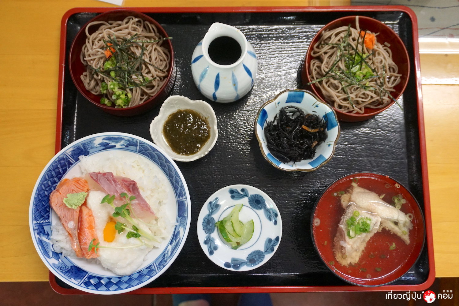 – Yamakakedon 900 เยน มีเซทคู่กับโซบะ izumo soba (ใช้เม็ดโซบะมาตำผสมมีสีเข้ม มีกลิ่นหอมกว่าที่อื่น) 1500 เยน