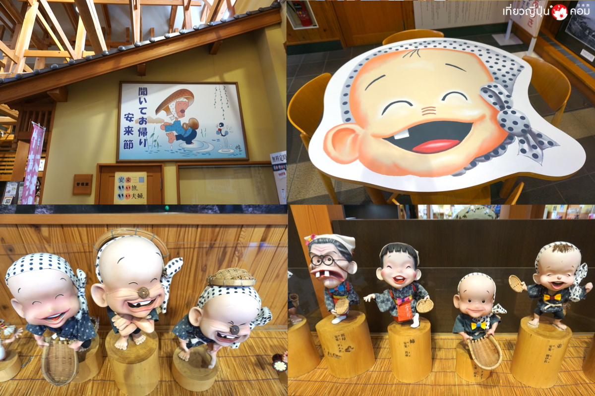 ภายในสถานีมีการจัดแสดงการแสดงตลกโบราณของญี่ปุ่นให้ดูระหว่างรอรถชัทเทิลบัสมารับ