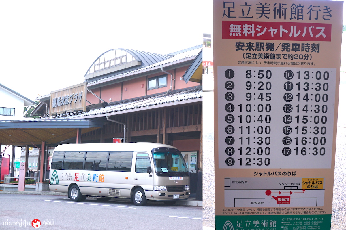 ตารางเวลาชัทเทิลบัสรับส่งระหว่างสถานี Yasugi – พิพิธภัณฑ์อาดาจิ (ใช้เวลา 20 นาที)