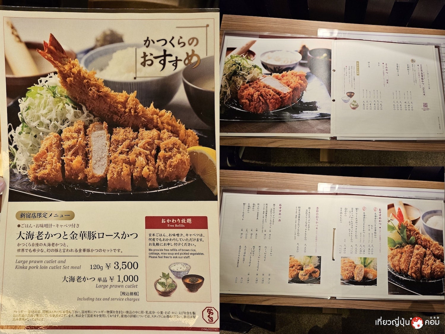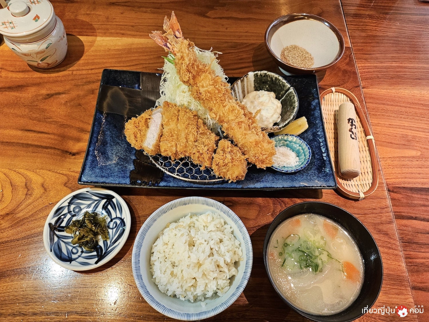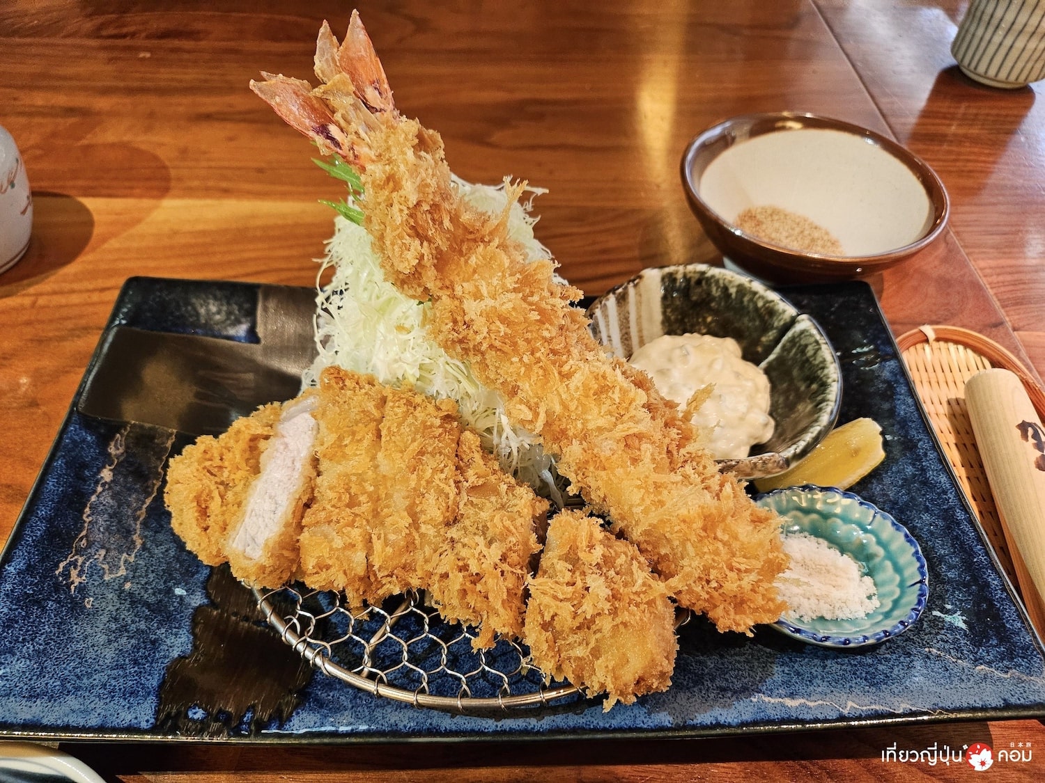 วันนี้เราสั่งเป็นเมนูปนะนำของทางร้านเซ็ต Oebi and Kinkaton Hire Katsu (3,600 เยน) ที่มีทั้งเนื้อสันใสสุดนุ่มและกุ้งตัวยักษ์ ชุบเกล็ดขนมปังทอดในน้ำมันพืชสำหรับทอดที่เป็นเคล็ดลับความอร่อย