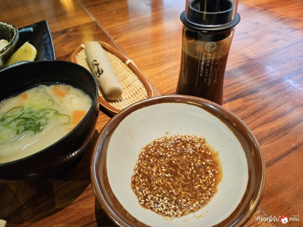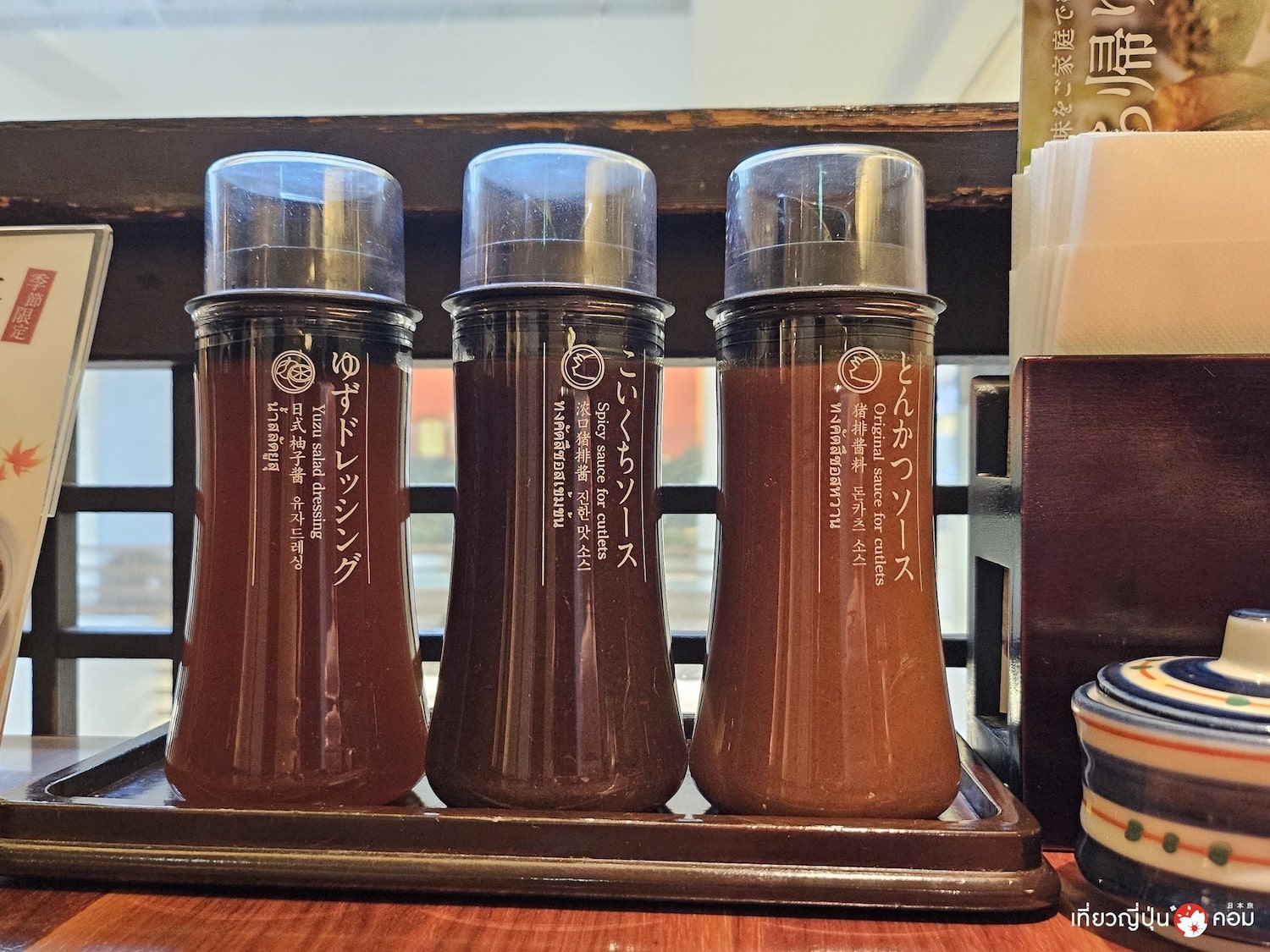 ใส่ซอสทงคัตสึสูตรหวานผสมกับงาเรียบร้อย ในชุดจะเสิร์ฟพร้อม ซุปมิโสะที่ผสมมิโสะขาวและมิโสะแดงเข้าด้วยกัน