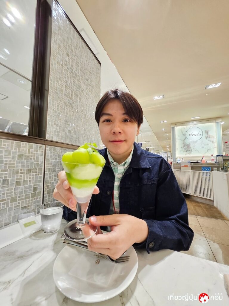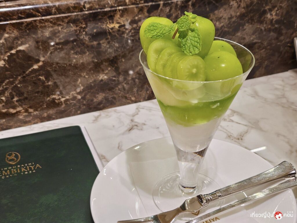 แน่นอนว่าเราเลือกสั่ง เมนู Shine Muscat Parfeit ที่ใช้องุ่นไชน์มัสคัตส่งตรงมาจากจังหวัดโอคายามะ ด้านในมีทั้งเยลลี่องุ่น และไอศครีสองุ่นเขียว รสชาตินุ่มนวล หวานน้อยอมเปรี้ยว กินแล้วสดชื่นสุดๆ