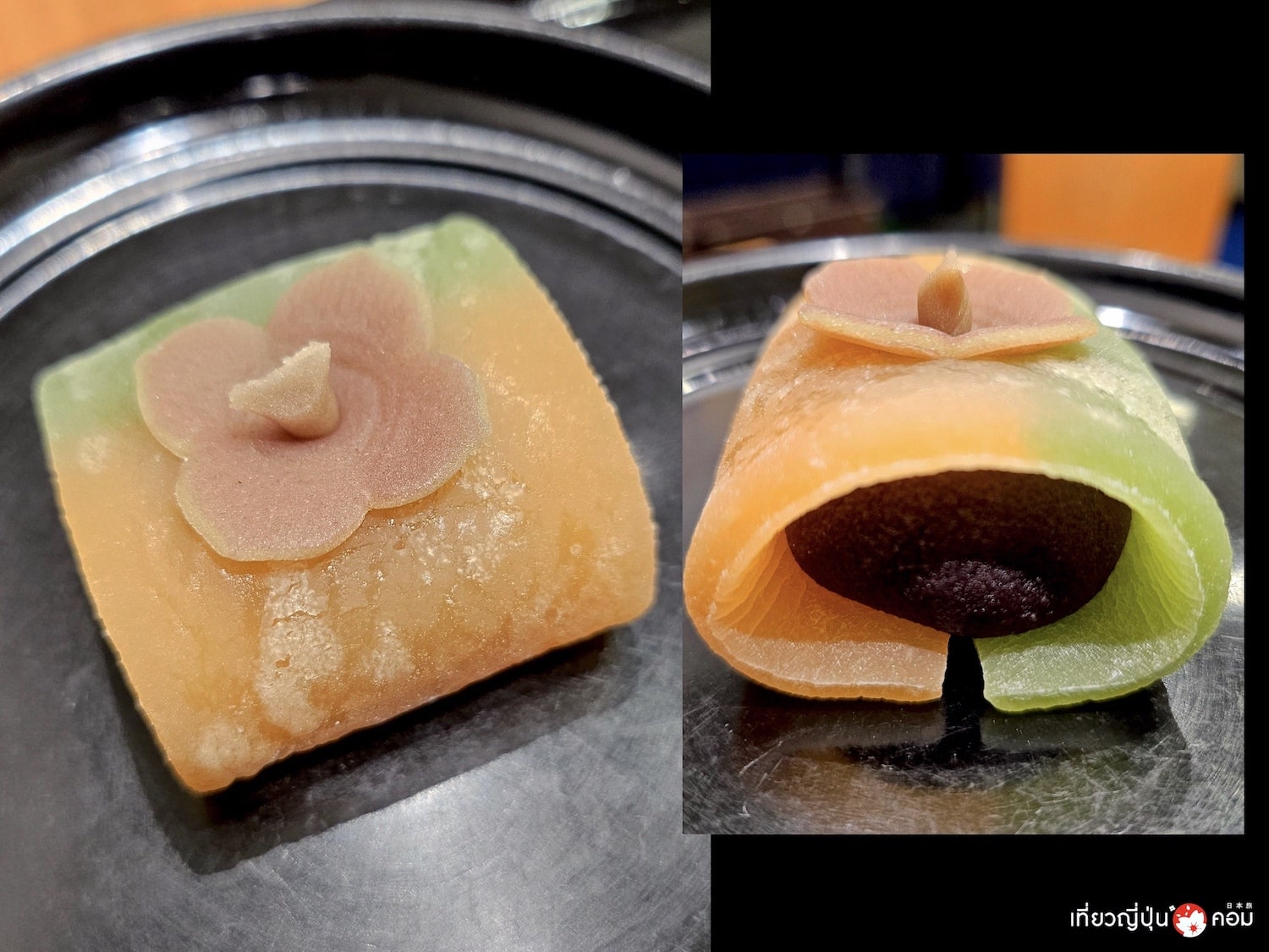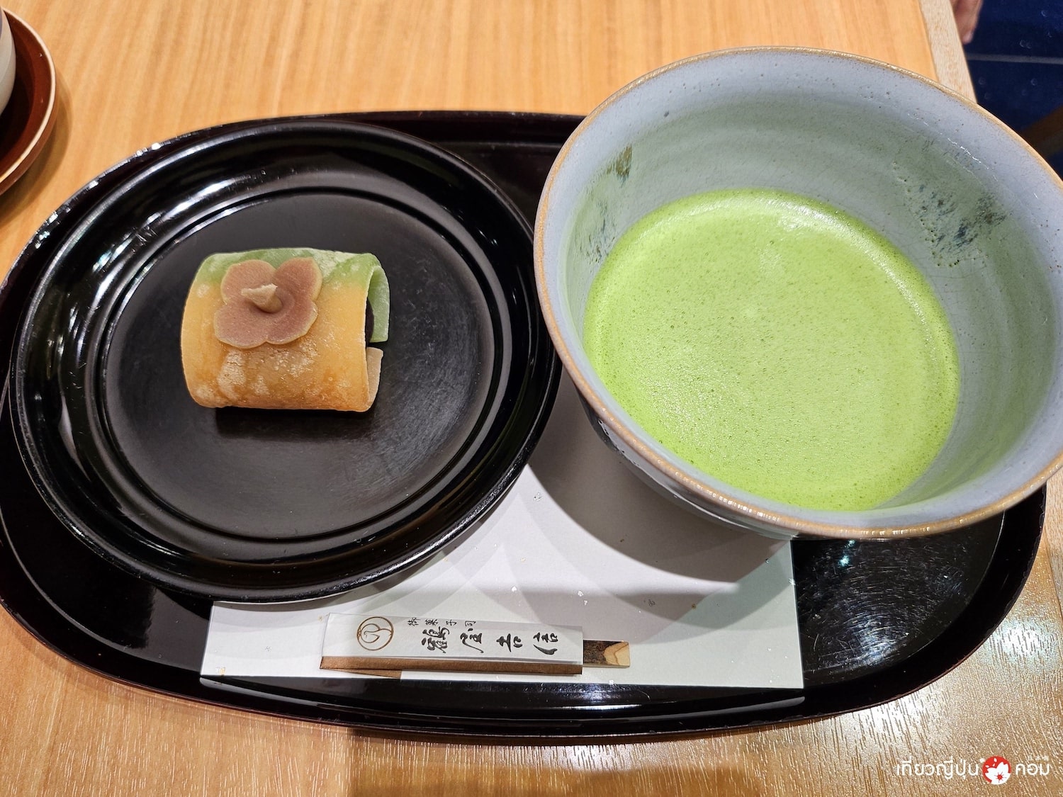 วันนี้เราเลือกเป็นเซ็ทวากาชิกับมัทฉะ ซึ่งจะมีขนมนามะกาชิ ที่เปลี่ยนไปตามฤดูกาลเช่นกัน สำหรับเมนูประจำวันมีให้เลือก 5 แบบ สั่งเป็นขนม Shushoku 秋色 แปลว่าสีสันฤดูใบไม้ร่วง ที่เป้นขนมสอดไส้ถั่วแดง ตกแต่งด้านนอกเป็นสีสันคล้ายลูกพลับ