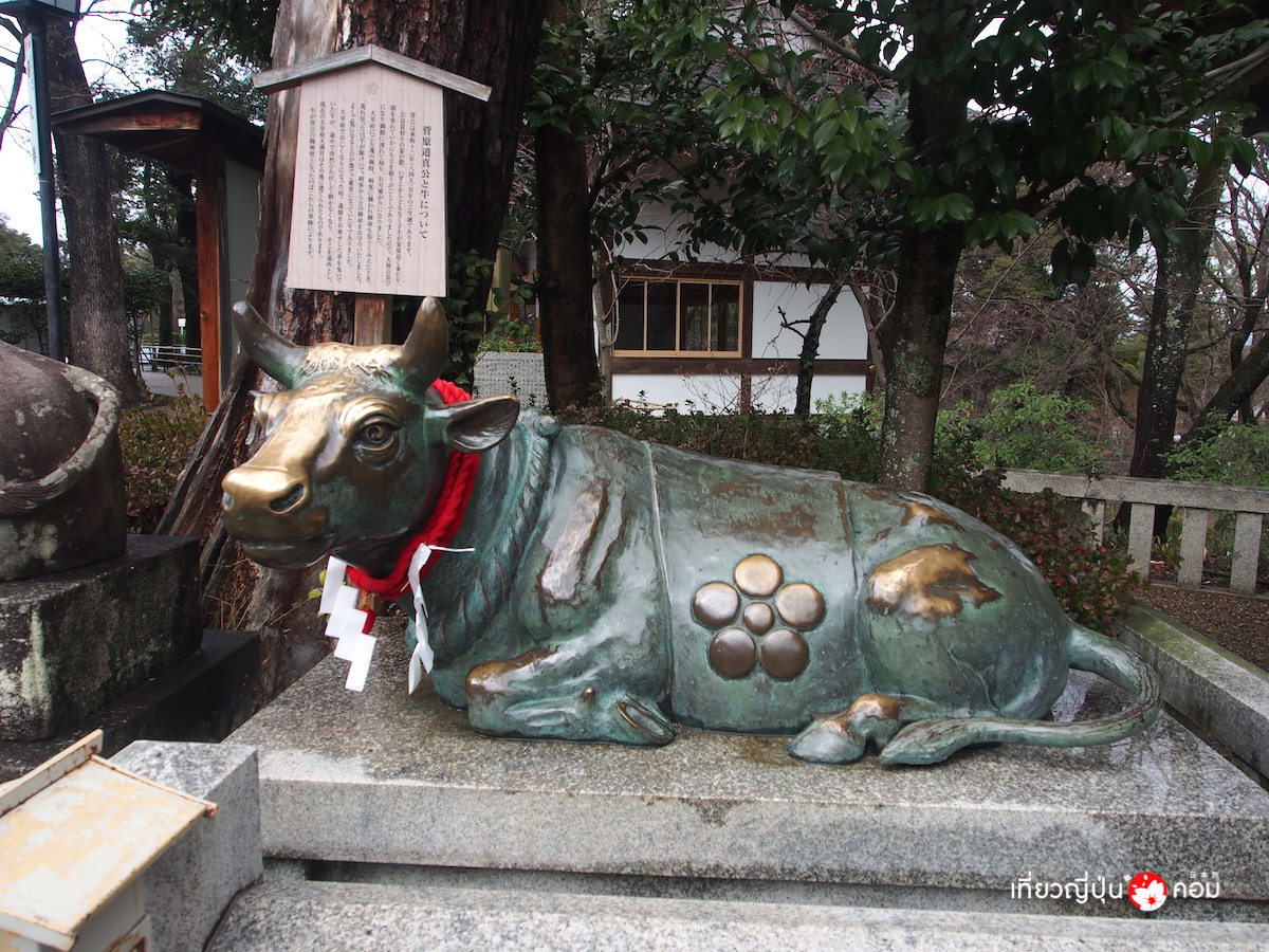 เพื่อให้ครบตามสูตรของการมาขอพรที่ศาลเจ้า Tenmangu ต้องลูบหัวเจ้าวัวข้างศาลเจ้า 1 ครั้ง โดยมีความเชื่อกันว่าจะทำให้ฉลาดขึ้นและพรที่ขอไปนั้นจะสำเร็จ