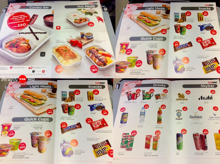 เมนูด้านใน มีอาหารให้เลือกหลายอย่าง ซึ่งราสามารถทำการสั่งจองอาหารล่วงหน้าออนไลน์ได้ ราคาจะถูกกว่าซื้อบนเครื่องครับ เหลือ 150 บาทจาก 180 บาท และทุกเมนูมาพร้อมกับน้ำดื่มด้วย สำหรับการจองออนไลน์เท่านั้น