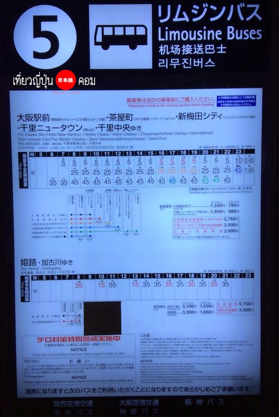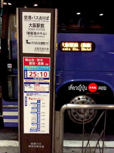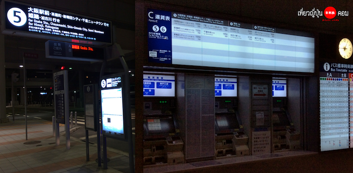 โดยปลายทางจะพาไปที่สถานี Osaka จอดตรงโรงแรม Hotel New Hankyu มีแค่คันนี้คันเดียวที่ให้บริการ แต่ถ้าเต็มจะมีรถอีกคันแสตนบายมารอรับส่งเพิ่มเติมครับ ฉะนั้นทางที่ดีควรหาที่พักแถวสถานี Osaka เอาไว้จะดีที่สุดครับ ป้ายรถบัสเบอร์ 5 ค่ารถคนละ 1550 เยน มีรอบ 0.45 น. และ 1.45 น. ส่วนรถบัสที่ให้บริการไปยังจุดหมายอื่นและในรอบเวลาอื่น