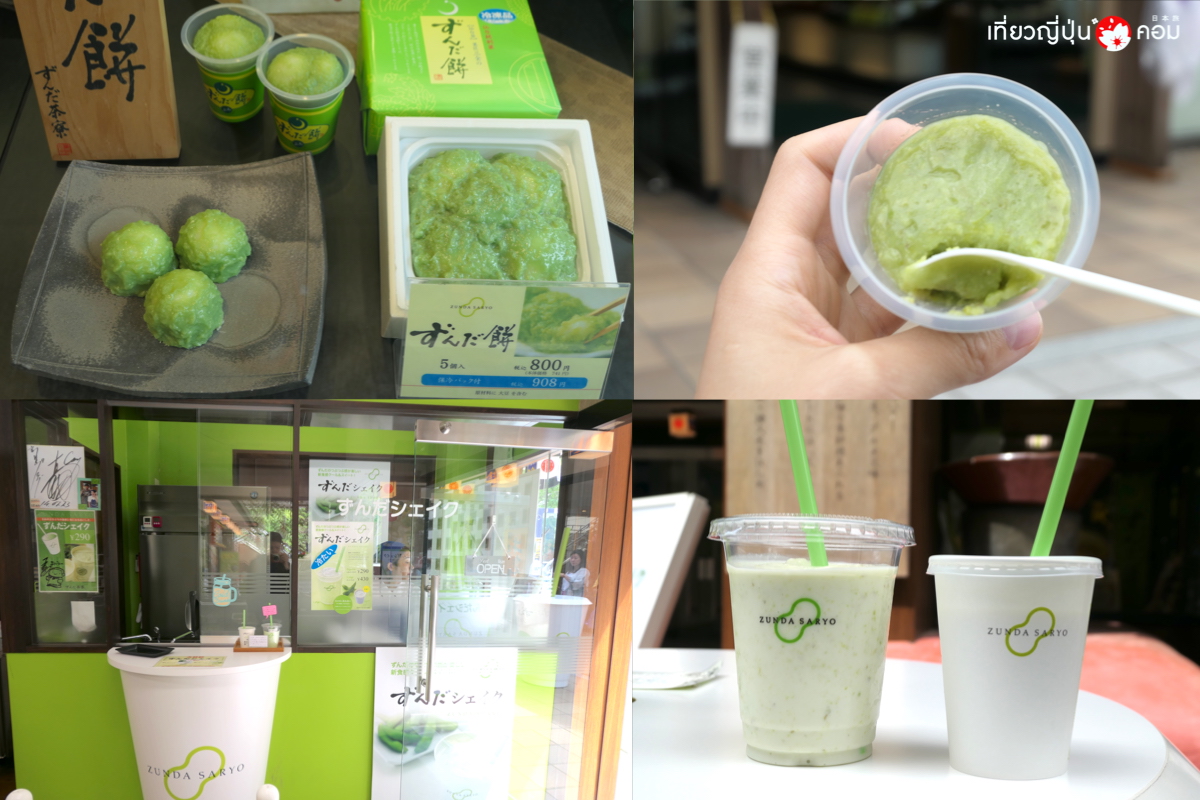 ก่อนกลับแวะร้านจุดขายของฝากด้านหน้า แนะนำว่าต้องลองของเมืองเซนไดนั่นก็คือ “ซุนดะโมจิ” (Zunda Mochi) ขนมพื้นบ้านชื่อดังของเมืองเซนได ทำมาจากถั่วแระญี่ปุ่นและธัญพืช ที่อุดมไปด้วยประโยชน์มากมาย สำหรับใครที่ไม่ชอบทานโมจิ แนะนำ “สมู้ตตี้ซุนดะ” (Zunda Saryo Shake) หวานเย็นชื่นใจ