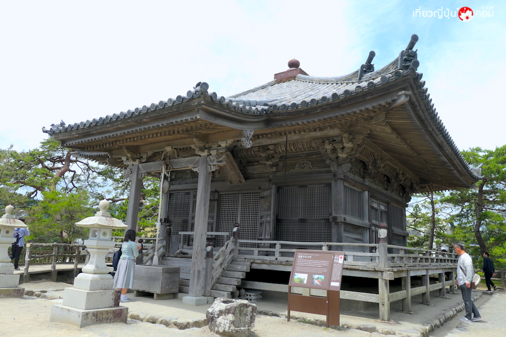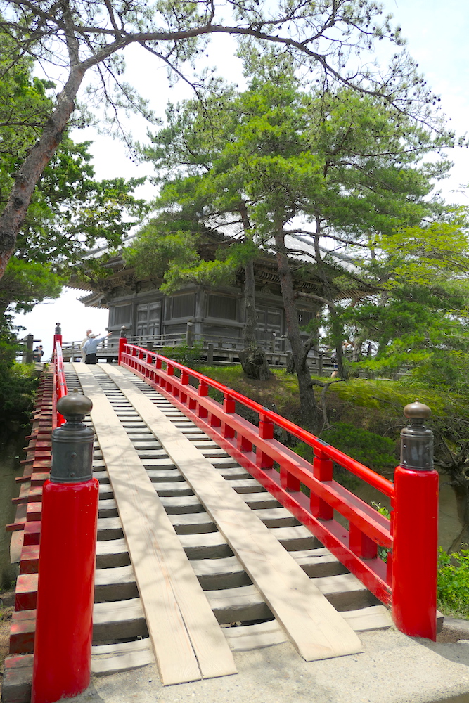 ตัววิหารตั้งอยู่บนเกาะเล็กๆเชื่อมกับฝั่งด้วยสะพานไม้สีแดงมีช่องระหว่างทางเดินทำให้สามารถมองเห็นน้ำทะลด้านล่าง โดยมีจุดประสงค์เพื่อเป็นการสร้างสมาธิในใจ ก่อนจะเดินไปถึงตัววิหารของวัด