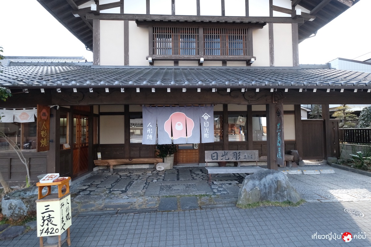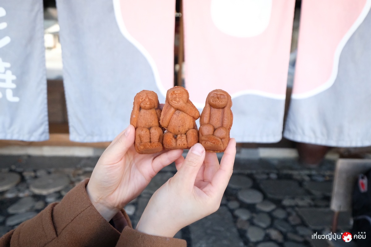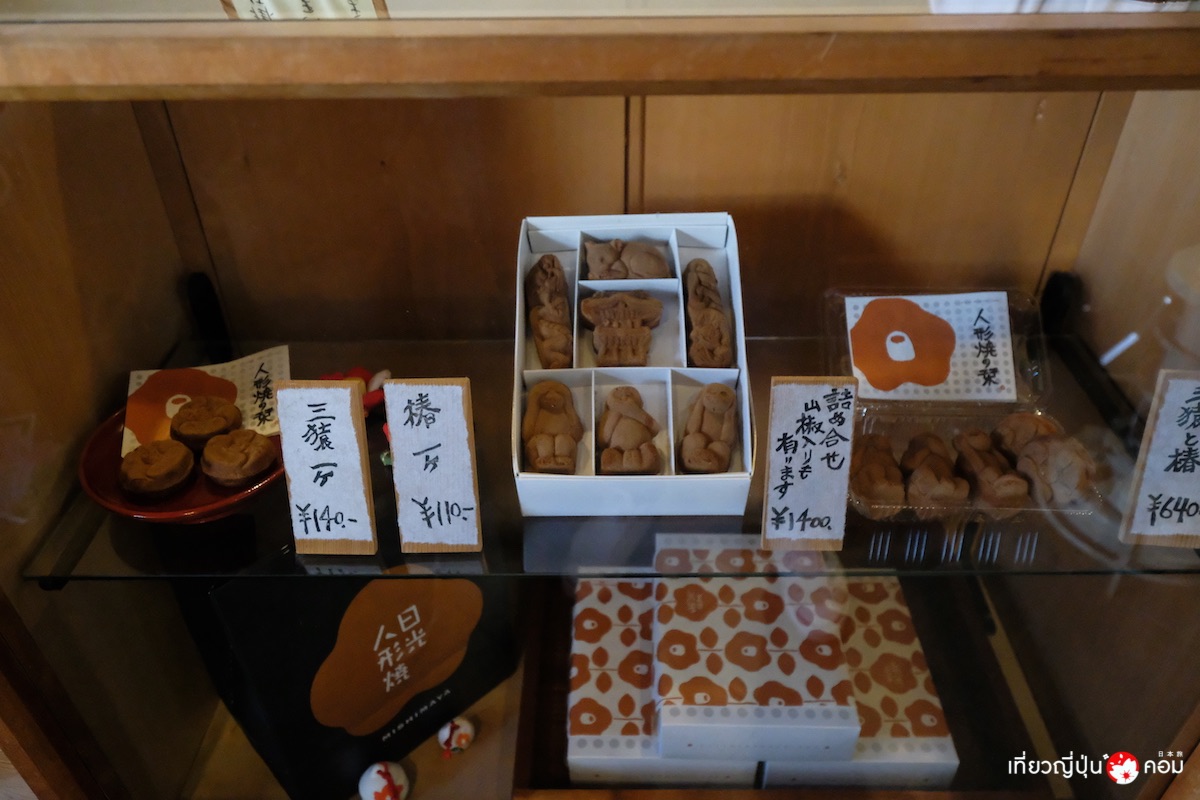 สำหรับรายการของฝาก ที่นอกจาก จะน่ารักแล้ว ยังอร่อยด้วย ก็ต้อง “นิกโก้ นินเงียวยากิ” (Nikko Ningyoyaki) เป็น ขนมไส้ถั่วแดง หอมหวาน ทำออกมาจากต้นแบบรูปสัตว์มงคล ที่ปรากฏอยู่ตาม งานแกะสลักชิ้นสำคัญ ภายในศาลเจ้าโทโชงู (Toshogu) อาทิ “ลิงสามตัว” ที่เอามือปิดหู ปิดตา และปิดปาก เป็นต้น ตัวร้านอยู่ไม่ไกลจากสถานีรถไฟ Tobu-Nikko สามารถเดินเท้าไปถึงได้ ทำให้แวะซื้อก่อนกลับโตเกียวได้สบาย