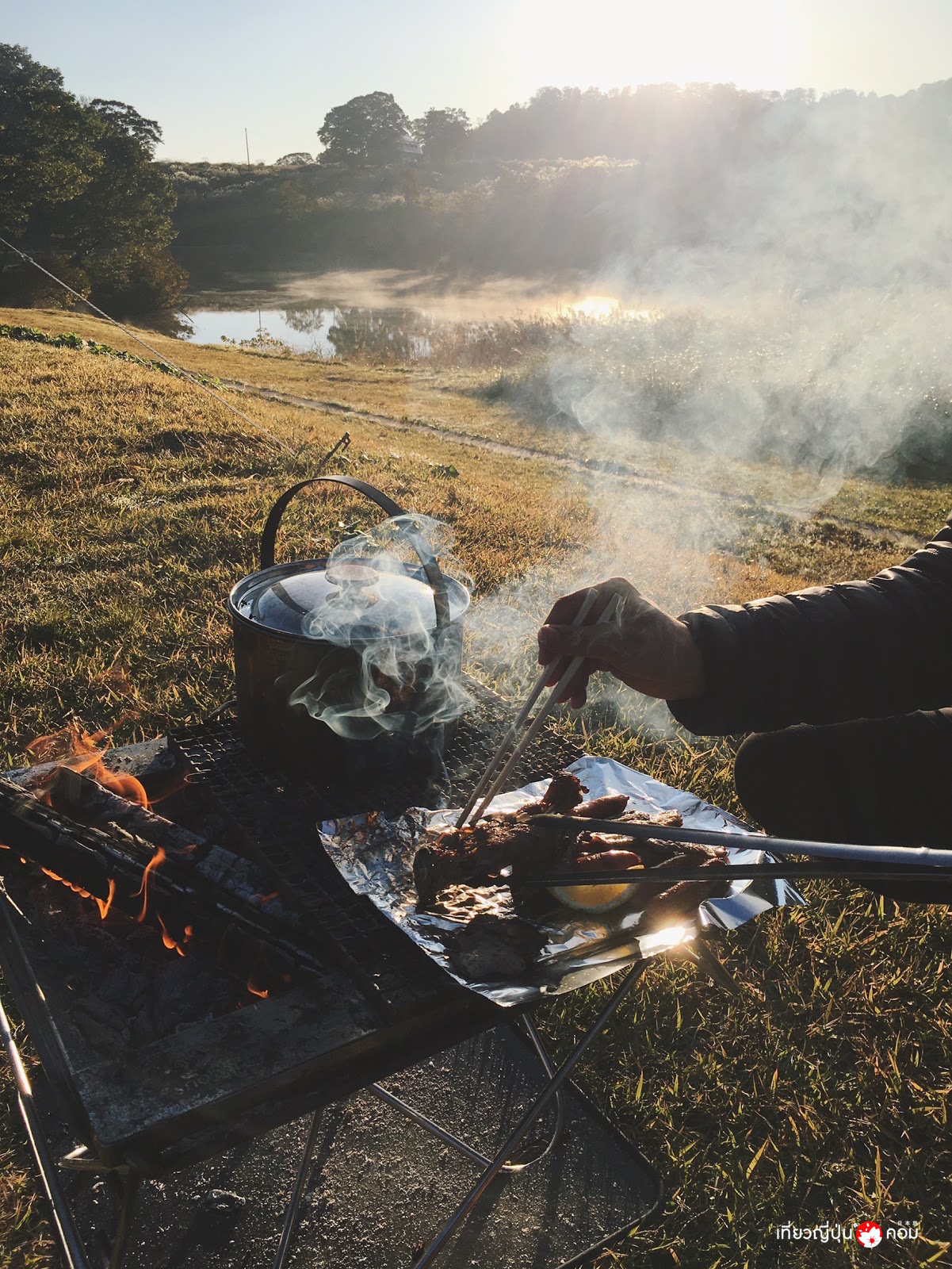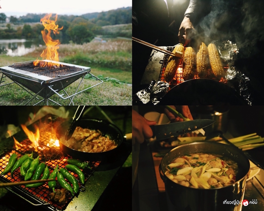 ตั้งแคมป์ ก่อกองไฟให้มีที่ให้อังมืออุ่นๆ คลายหนาวแล้ว ถึงเวลาทำอาหารเย็นกันต่อ เพราะพอเข้าสู่ฤดูใบไม้ร่วงแล้ว ฟ้าจะมืดเร็วมาก อาหารทุกอย่างสำหรับทำบาร์บีคิว จะต้องซื้อมาจากข้างนอกเองเท่านั้น และอากาศหนาวๆแบบนี้ ต้องมีต้มยำเผ็ดร้อน ซดให้หายหนาว ปิดท้ายด้วยข้าวโพดปิ้งหอมเนย