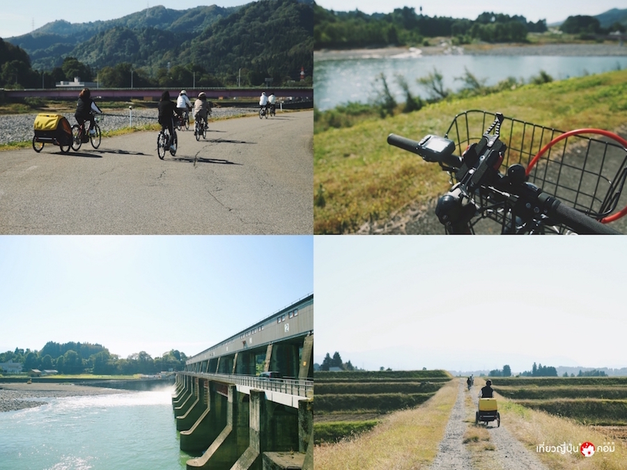พวกเราเลือกปั่นจักรยานไฟฟ้า บอกเลยว่าช่วยทุนแรงได้เยอะมาก เส้นทางนี้ในช่วงแรกเราจะปั่นผ่านเขื่อน และผ่านทุ่งนากว้างๆ