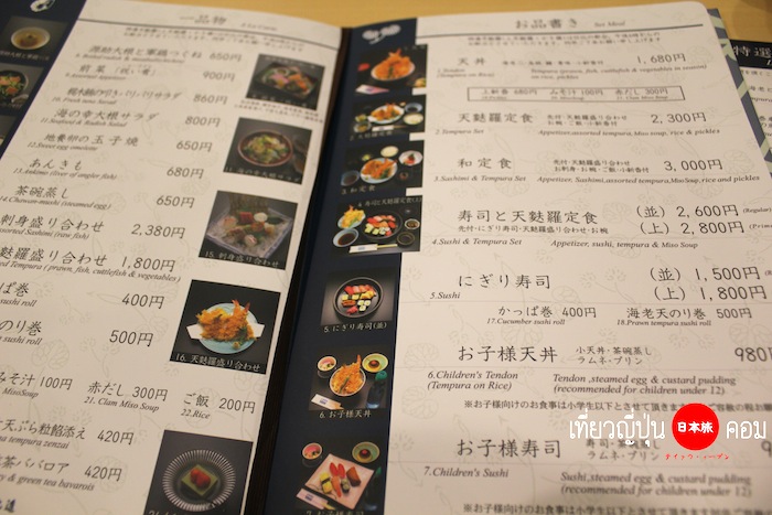 มีเมนูอยู่ด้านหน้าร้าน สามารถลองเลือกดู ตัดสินใจก่อนเข้าไปในร้านได้ ราคาค่อนข้างสูงถ้าเทียบกับร้านอาหารทั่วไป แต่ถ้าตั้งใจจะมาลอง ได้กินสักครั้งก็ไม่น่าเสียดาย ร้านนี้แพงแต่อาหารคุณภาพจริงๆ ปริมาณก็ให้เยอt (ดูจากขนาดของกุ้งที่โปะลงบน Tendon 天丼 ชามนี้ได้)