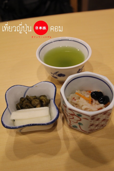 พอเข้ามาในร้าน พนักงานก็จะพามาที่โต้ะ พร้อมกับเมนู และเสิร์ฟชาเขียวร้อนๆ (ชาเขียวของทางร้านหอมและอร่อยมาก)