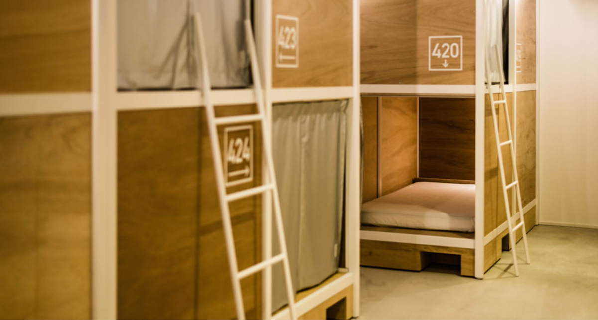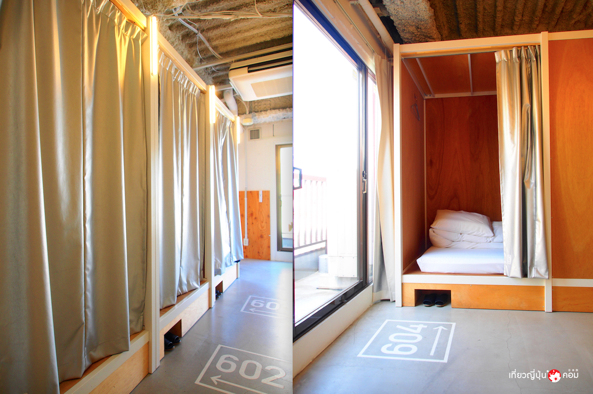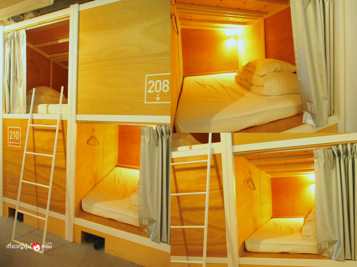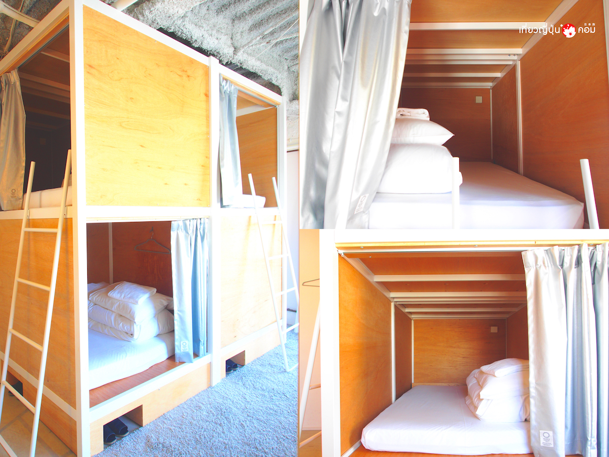 ห้องพักรวมแบบ Bunk Bed แต่มีความเป็นส่วนค่อนข้างสูง ในราคาที่สามารถจับต้องได้ ราคา 3,000 เยนต่อคน / คืน มีม่านกั้นส่วนตัว ไฟอ่านหนังสือ และปลั๊กสำหรับชาร์จไฟถึง 2 หัว พร้อมตะขอและไม้แขวนเสื้อ ตั้งอยู่บริเวณชั้น 2-3-5 ของโฮสเทล