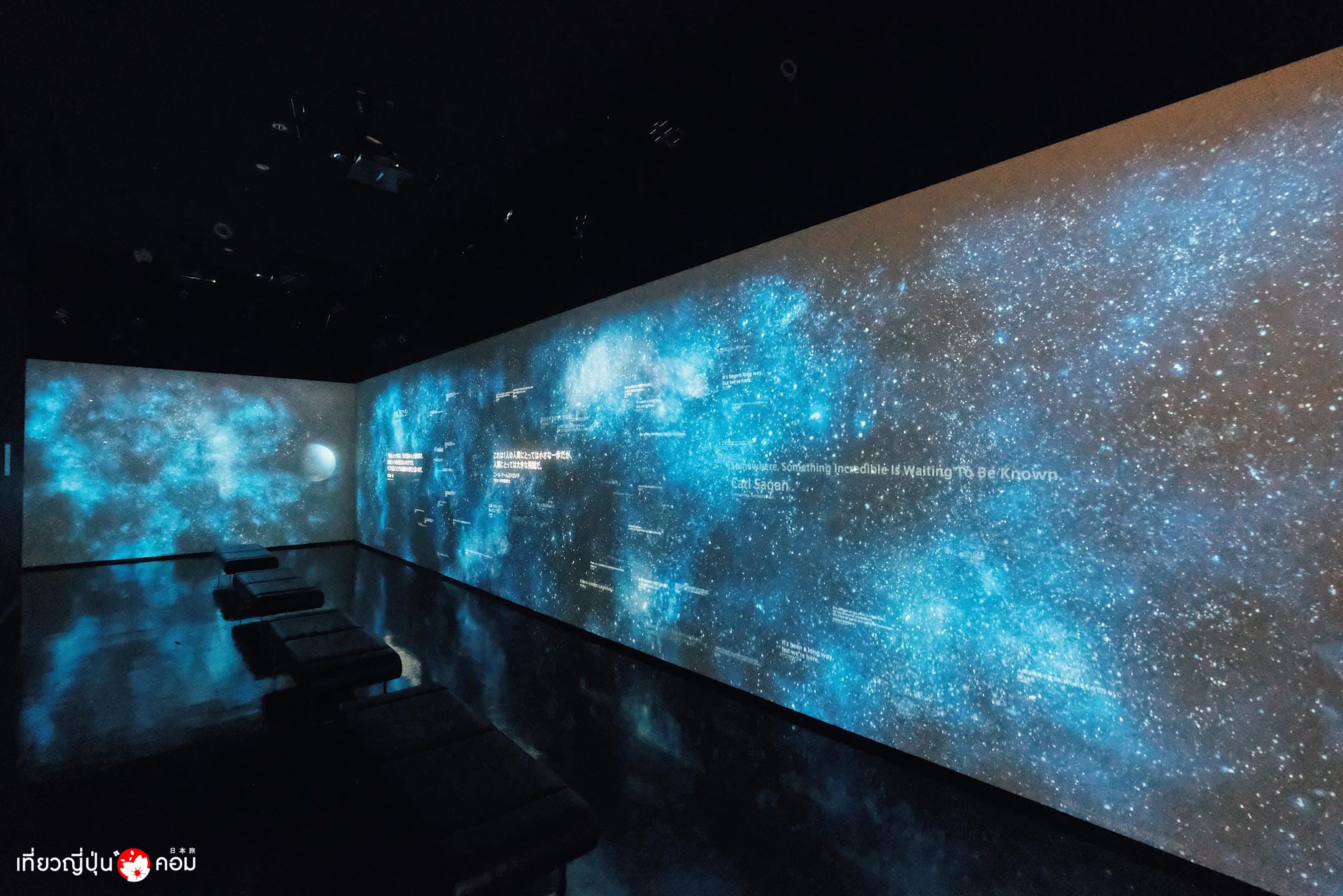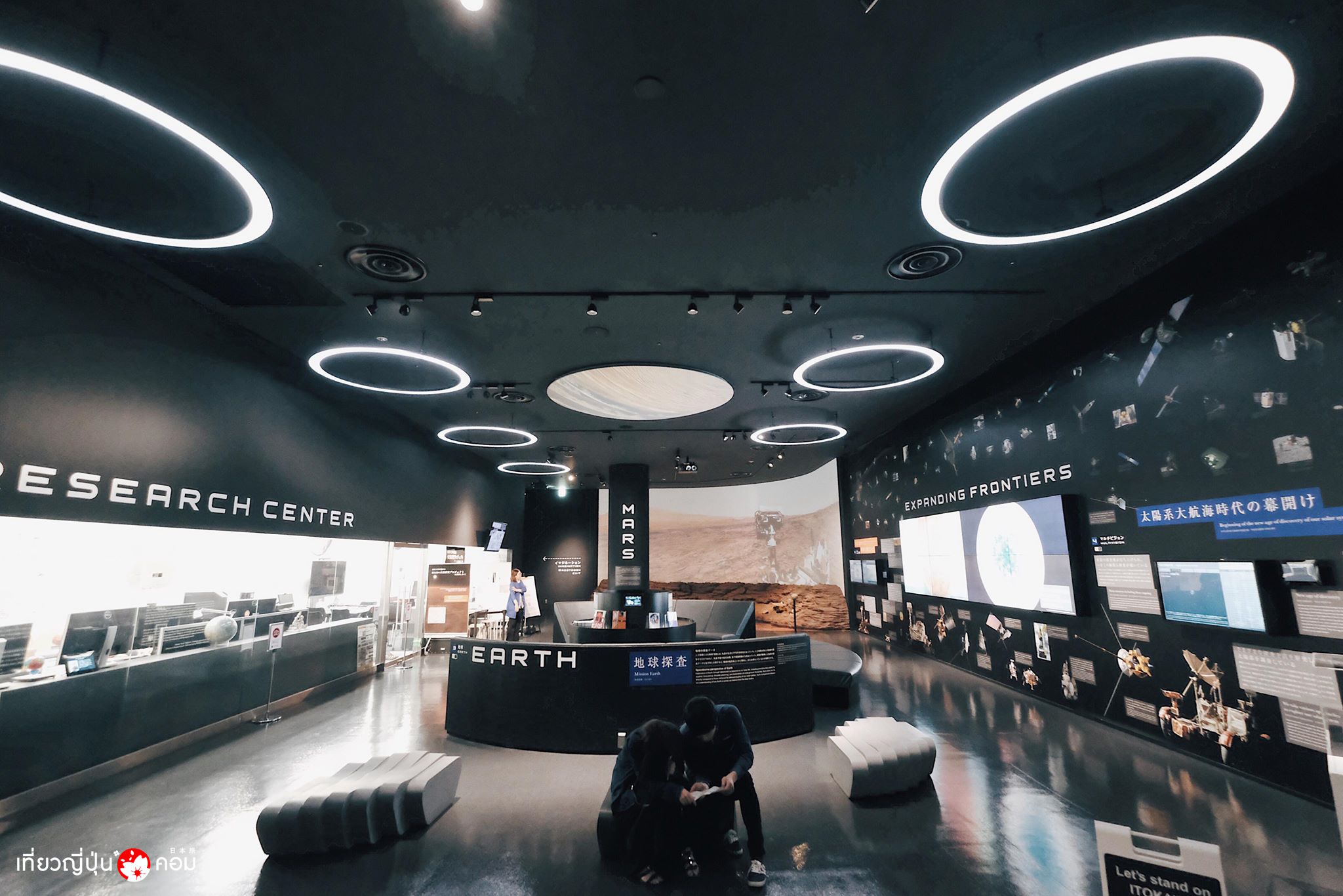 ภายในแบ่งออกเป็น 9 โซน โดยไฮไลท์เด่น ๆ จะอยู่ที่ Starting Room ห้องวีดีโอ ฉายภาพจักรวาลด้วยเทคนิคการนำเสนอแบบ Projection Mapping และ Theatre Sora ซึ่งเป็นจุดที่พวกเราชอบมากที่สุด เพราะจะได้ยืนดูจอภาพขนาดยักษ์ ในมุมมองที่เสมือนกับ กำลังจ้องมองโลก จากสถานีอวกาศเลยทีเดียว เป็นอะไรที่สวยงามและน่าตื่นตาตื่นใจมากๆ