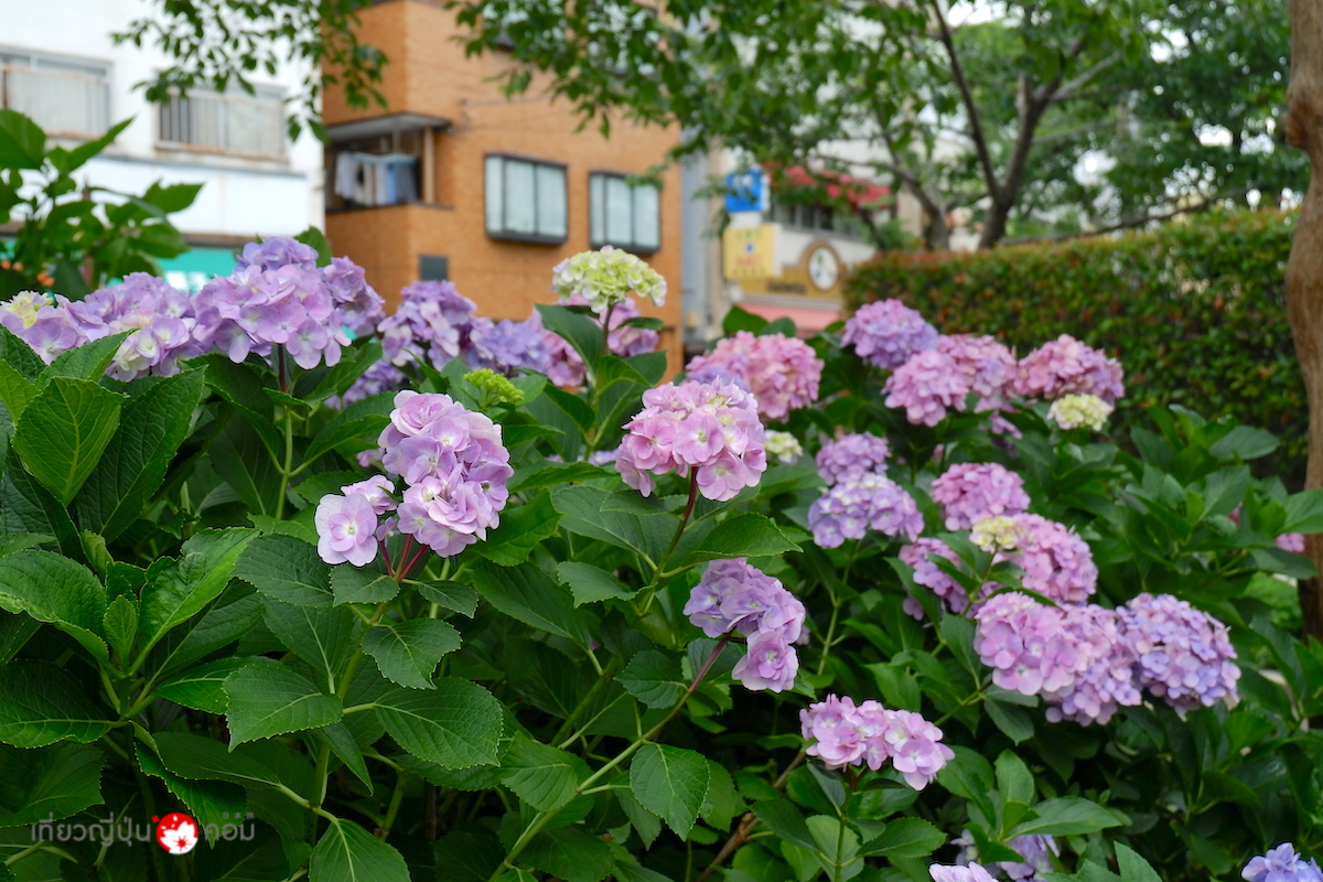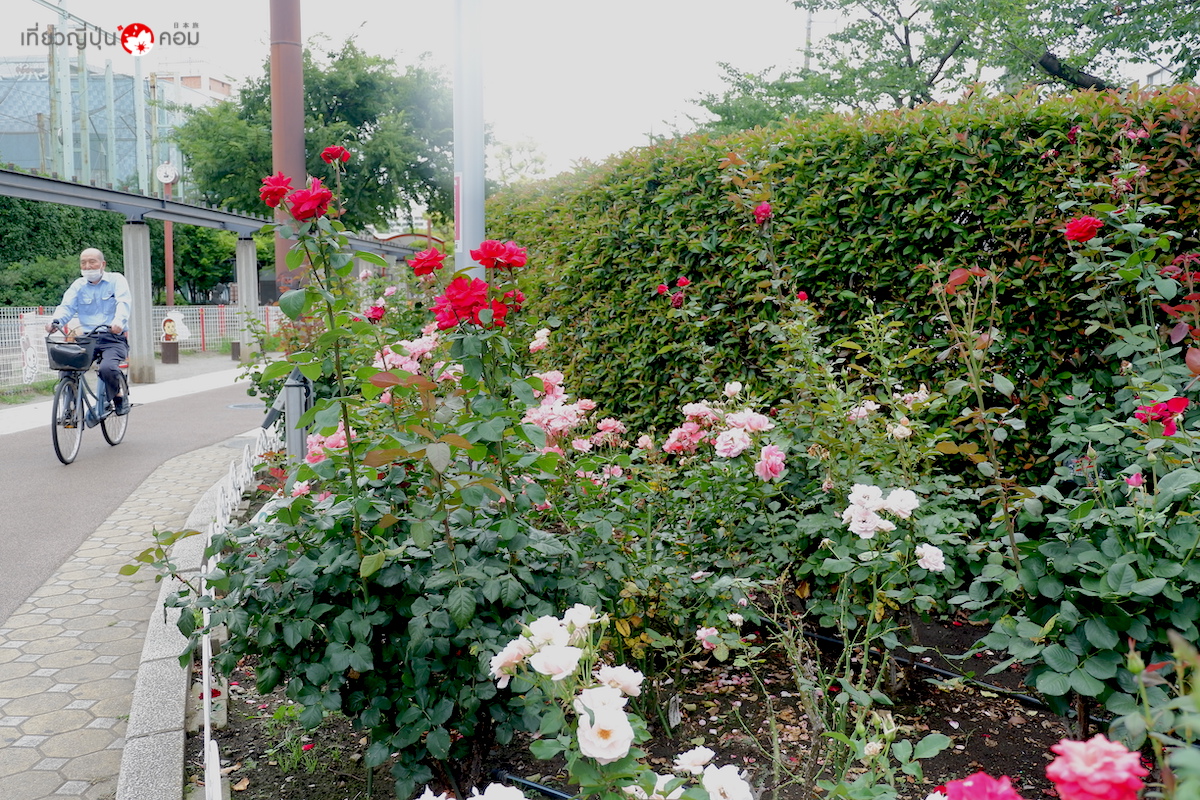 ช่วงซัมเมอร์แบบนี้หลังซากุระร่วงโรยไปหมดแล้ว ก็จะเป็นช่วงที่ดอกไม้สวยๆเริ่มผลิดอกเบ่งบาน ระหว่างทางที่เดินไปยังสวนสนุก จะเดินผ่านแปลงดอกไม้มากมายทั้งดอกกุหลาบและดอกไฮเดรนเยียร์