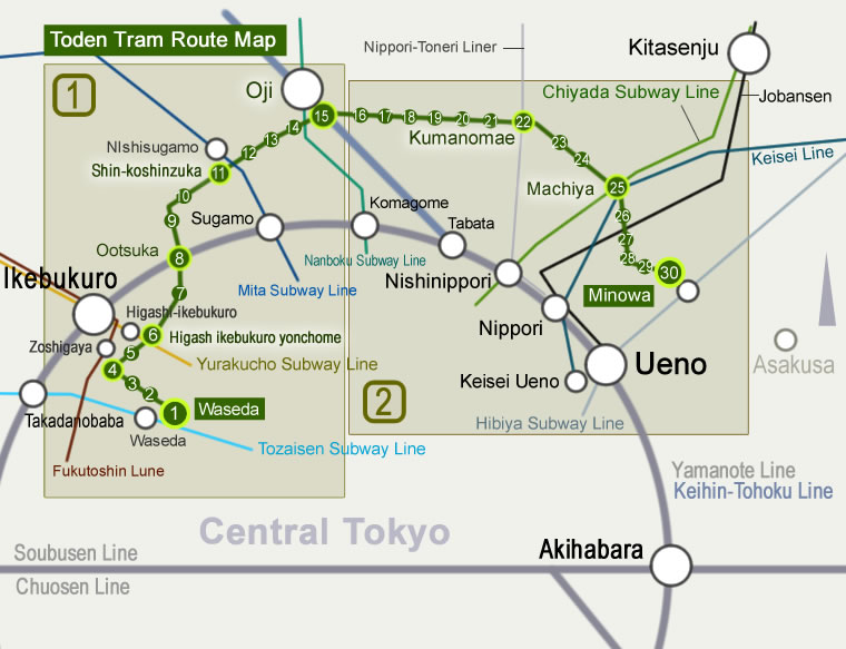 แผนที่เส้นทางรถราง ที่เชื่อมต่อกับสถานีรถไฟหลักในโตเกียว