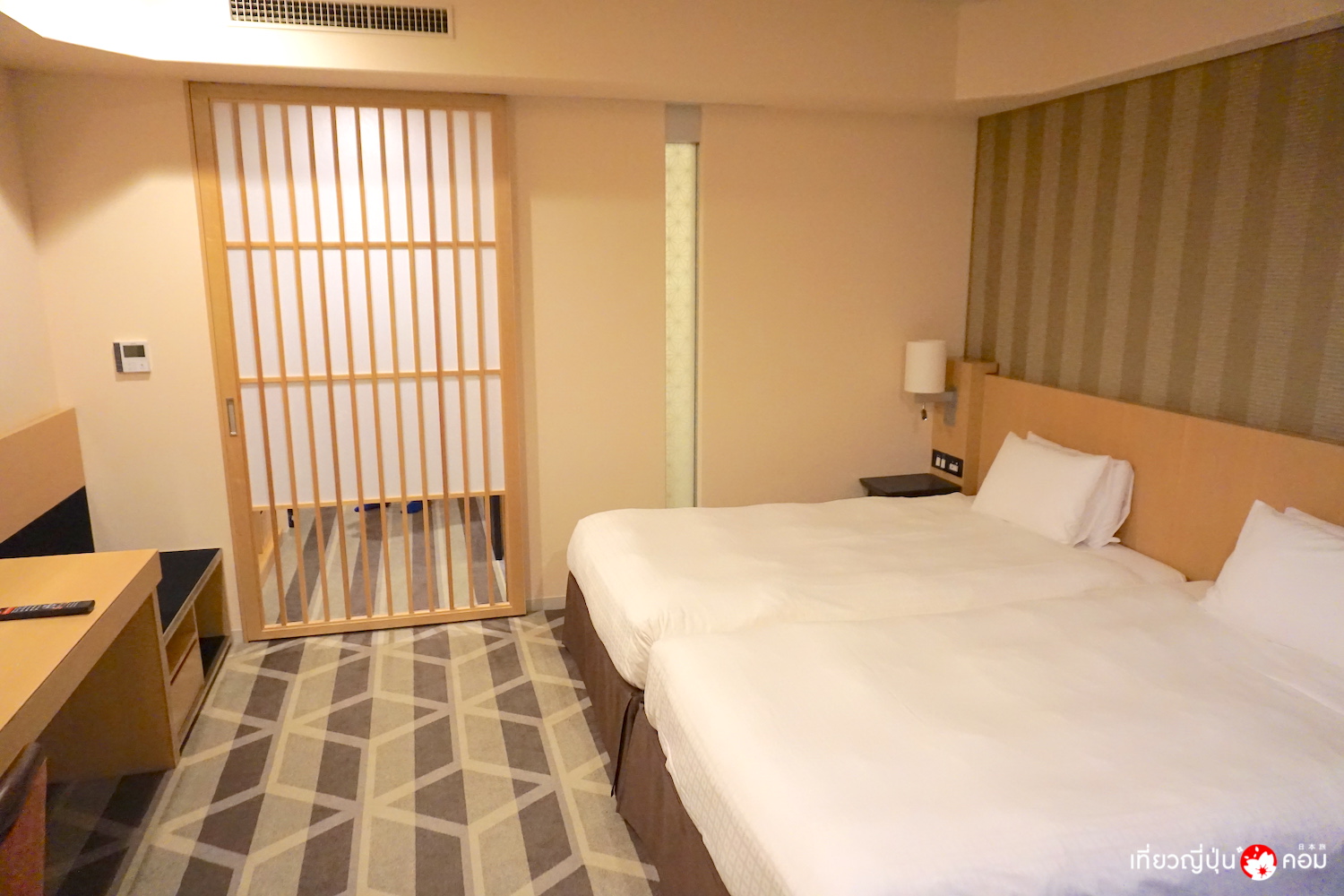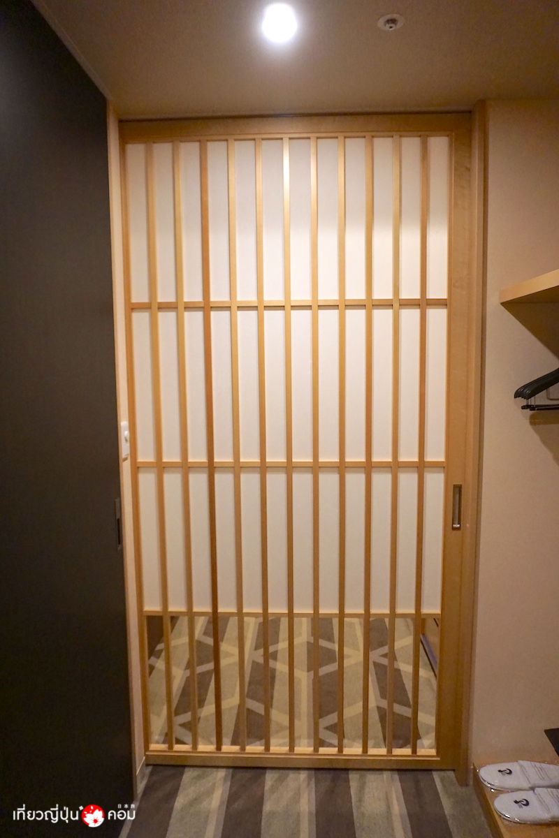 มีประตูเลื่อนไม้แบบญี่ปุ่นแบ่งกั้นพื้นที่ของห้องนอนและห้องน้ำไว้อย่างเป็นระเบียบ