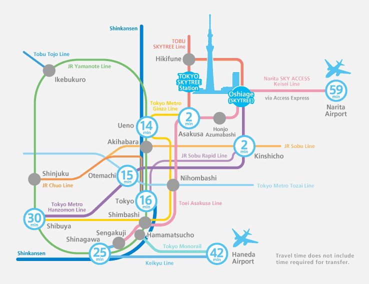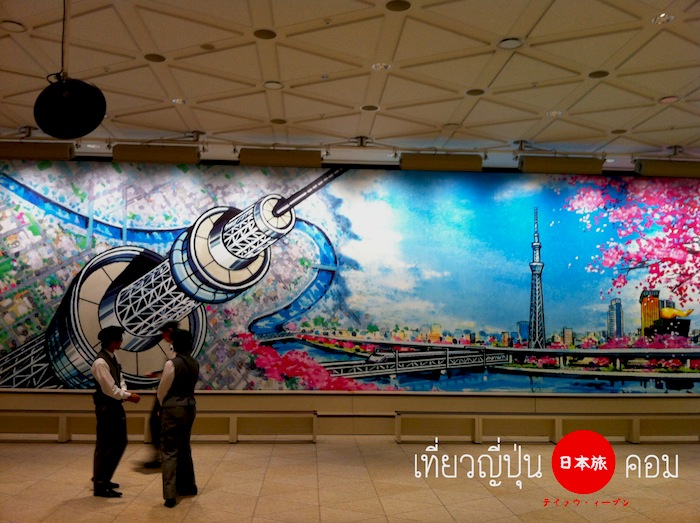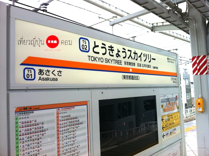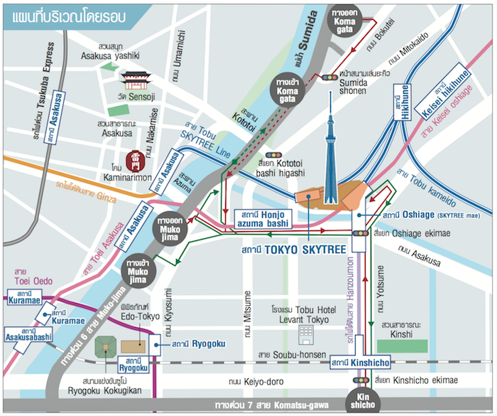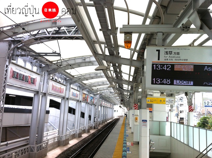 - * จากสถานี Ueno (นั่งรถใต้ดิน Tokyo Metro สาย Ginza) เปลี่ยนเป็นสาย TOBU SKYTREE ที่สถานี Asakusaใช้เวลา 14 นาที