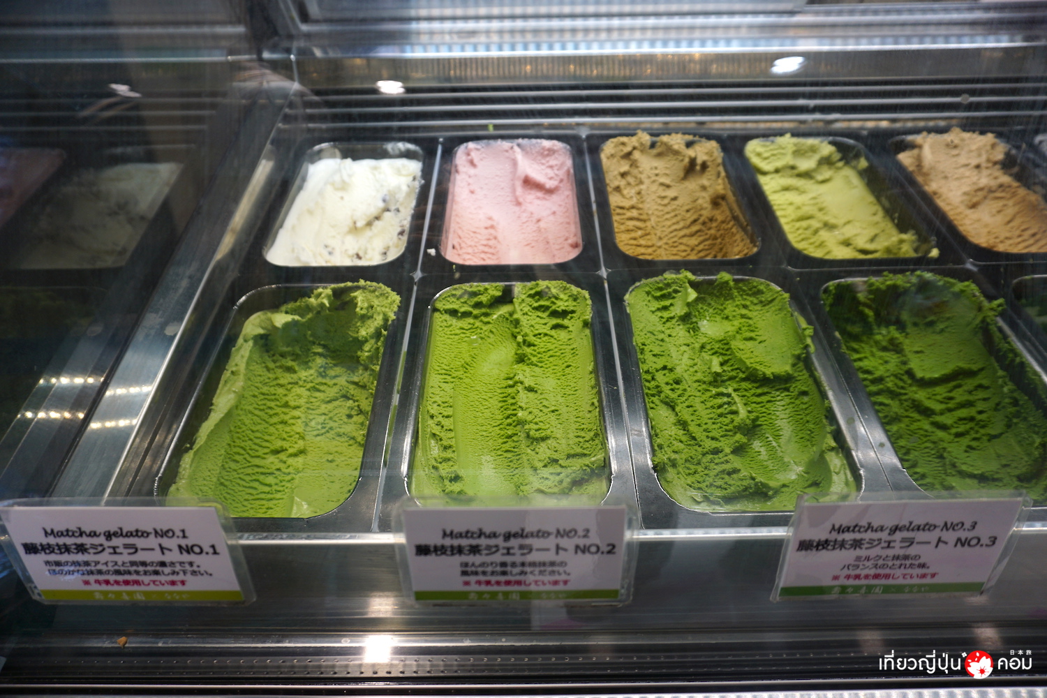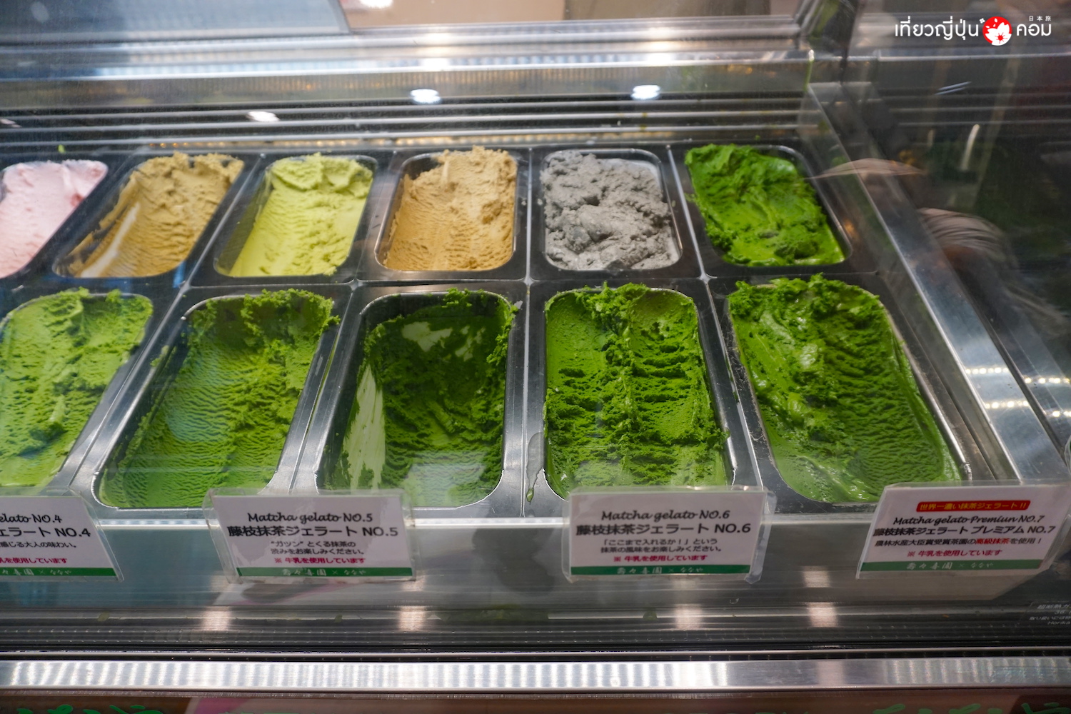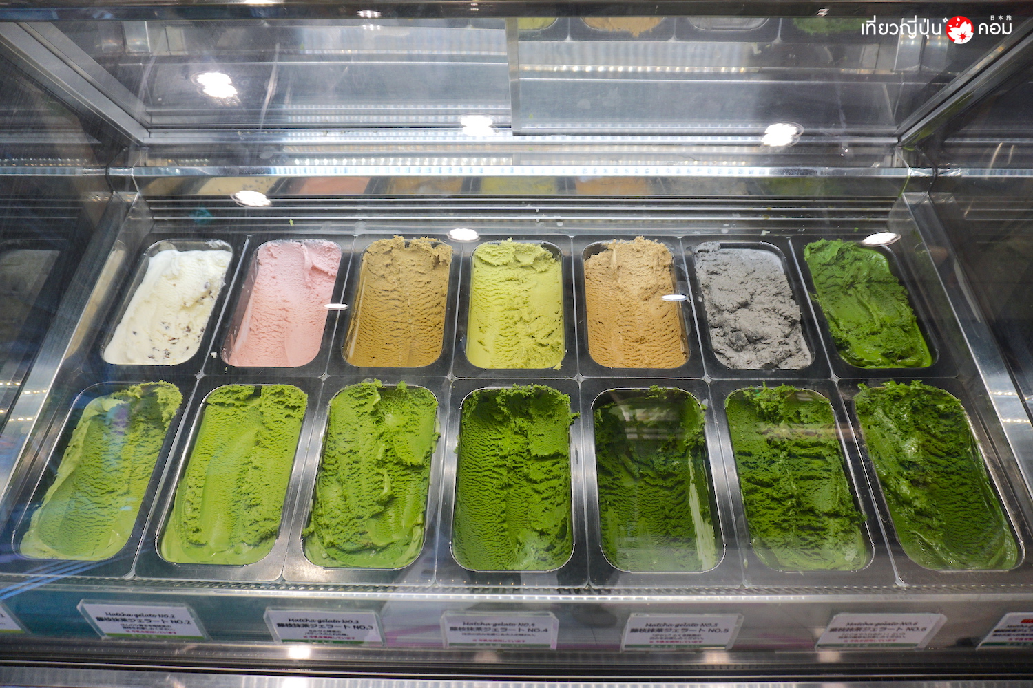 มาดูวิธีการสั่งกันก่อน เริ่มจาก เจลาโต้ มัทฉะ ที่มีให้เลือก 7 ระดับ ที่ไล่ระดับจาก No.1 ความเข้มข้นน้อยที่สุด ไปจนถึง No.7 ความเข้มข้นมากที่สุด นอกจากนี้ก็จะมีรสชาตอื่นๆให้ได้ลองชิมกันด้วย อาทิ งาดำ, โฮจิฉะ, ชาข้าว, ชาดำ, ถั่วแดง, สตรอเบอร์รี่