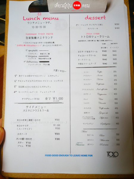 เมนูของทางร้าน มีทั้งเมนูอาหาร ขนมปัง เครื่องดื่ม ถ้าสั่งชูครีมโทโทโร่ ทานในร้าน จะแพงกว่าชิ้นละ 40 เยน