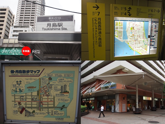 วิธีการเดินทาง (ตั้งต้นจากสถานี Tokyo หรือ ตลาดปลา Tsukiji) ขึ้นรถใต้ดิน Tokyo Metro จากสถานี Yurakucho ลงที่สถานี Tsukishima ออกทางออก 7 มายัง Monja Street สามารถเดินเที่ยวบริเวณรอบๆ ไปยังศาลเจ้า Sumiyoshi ได้ และหากต้องการแผนที่เดินเที่ยวและข้อมูลของร้านอาหารเด็ดๆ ให้เข้าไปที่ศูนย์ให้ข้อมูล Tsukishima Monja Association ด้านหน้าทางออกสถานีได้เลย