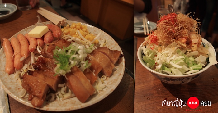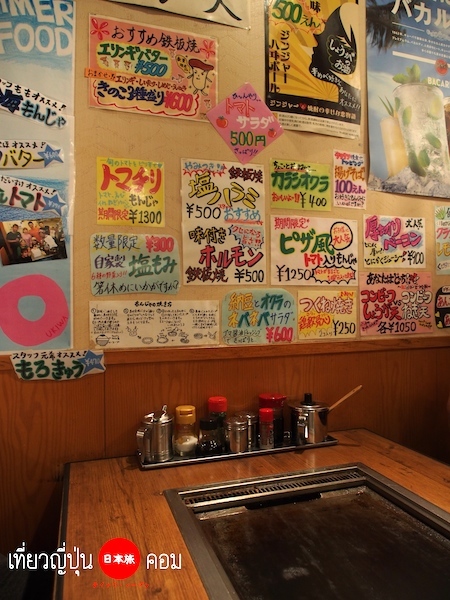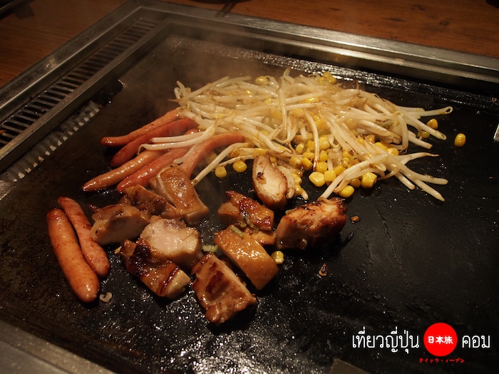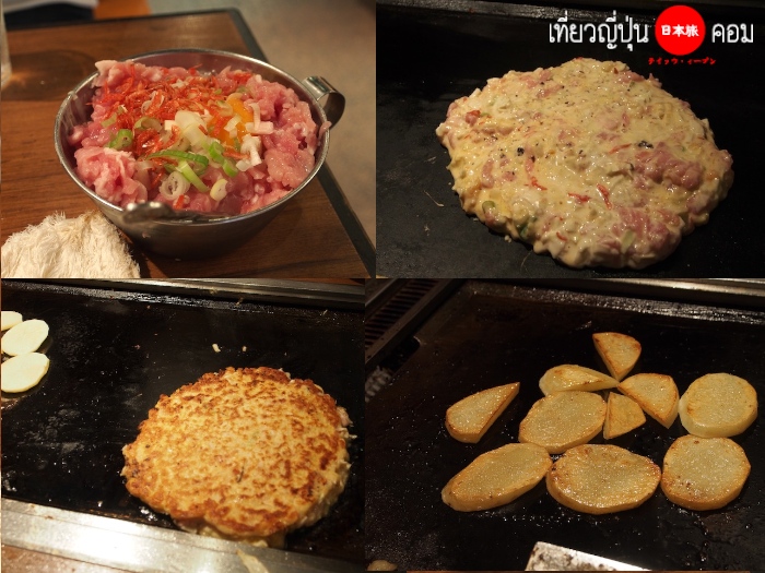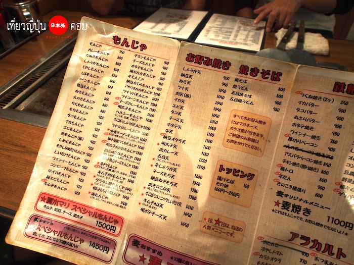 โดยทั่วไปแล้ว เมนูหลักที่ต้องสั่งก็คือ Monjayaki และ Okonomiyaki โดยจะมีส่วนผสมเป็นเนื้อสัตว์ต่างๆเช่น หมู ไก่ กุ้ง ปลาหมึก เส้นโซบะ เส้นอุด้ง ผักชนิดต่างๆ สามารถเลือกได้ตามใจชอบ และ จะเลือกสั่งท้อปปิ้งที่เราอยากจะมาย่างกินมาเพิ่ม เช่น เนื้อไก่ เนื้อหมู ไส้หรอกญี่ปุ่น ผักต่างๆ ด้วยก็ได้ครับ