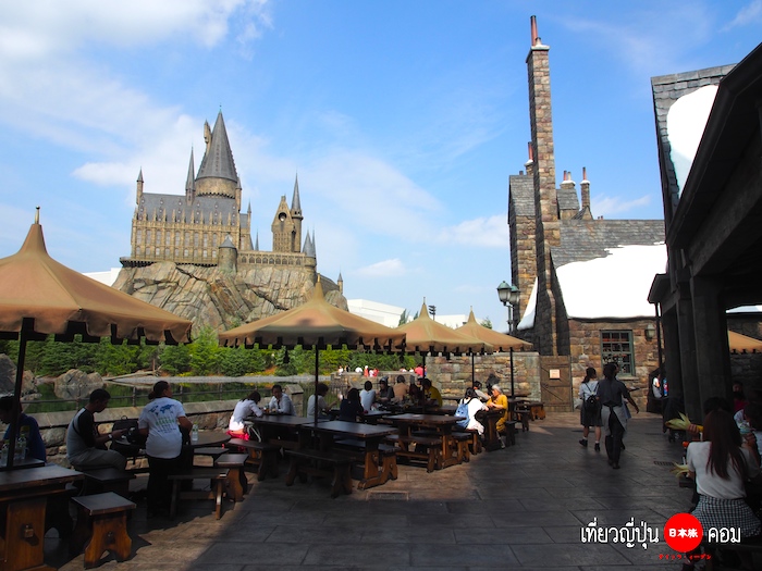 และแล้วเราก็มาถึงร้านไม้กวาดสามอัน ที่หมู่บ้านฮ็อกส์มีด คิวก็ยาวอีกเช่นเคย มื้อนี้ต้องขอฝากท้องไว้ที่นี่เท่านั้นครับ เพราะว่าอยากจะได้บรรยากาศด้านนอกที่มองเห็นปราสาทกับทะเลสาบ