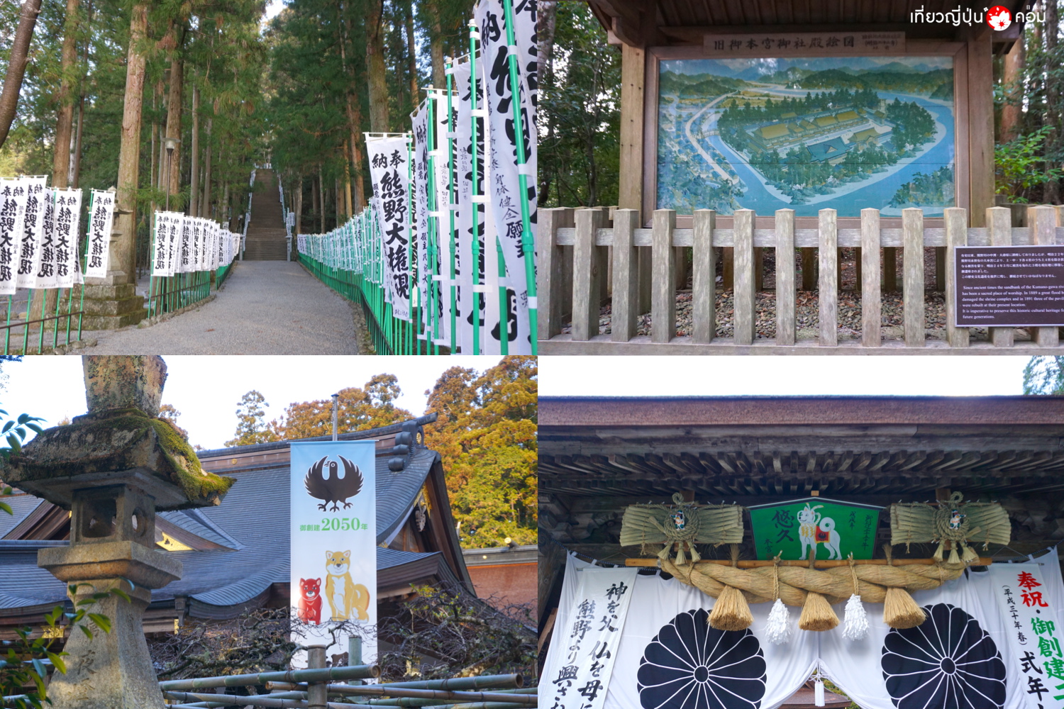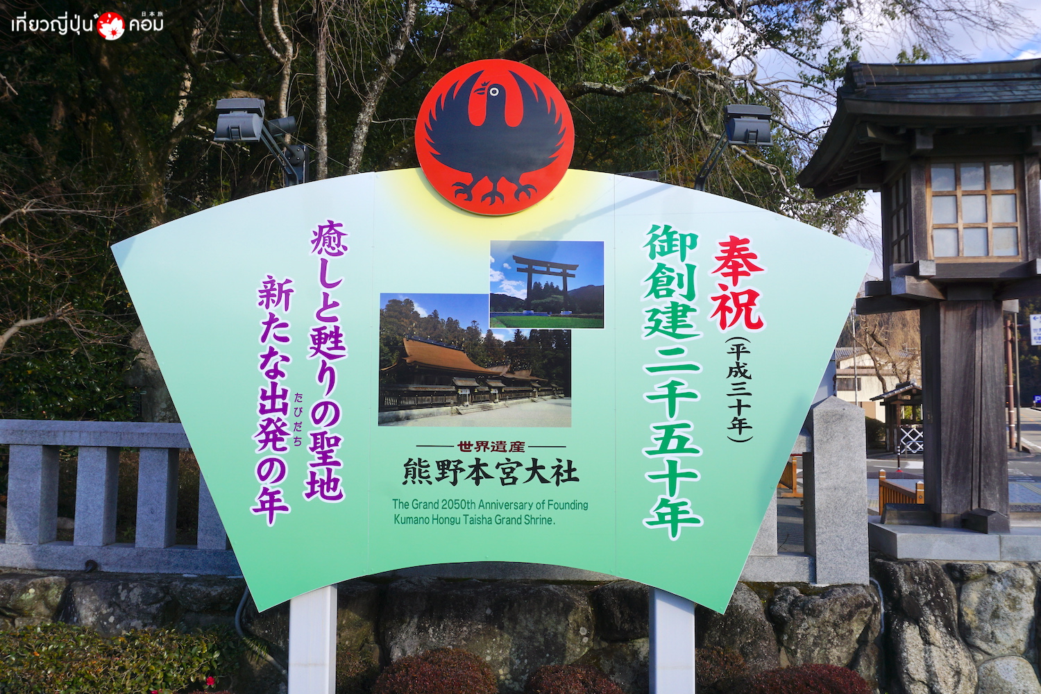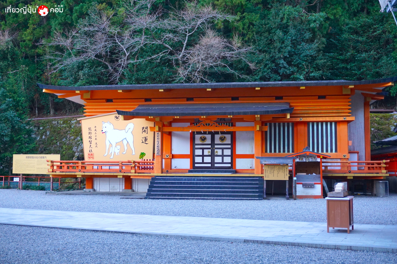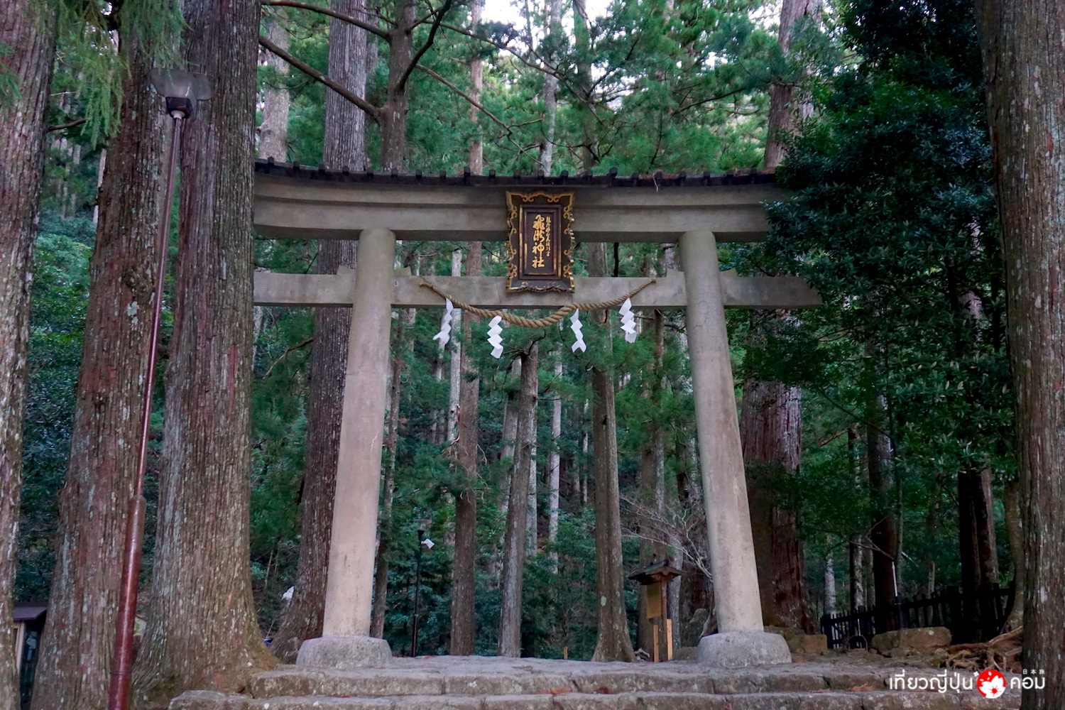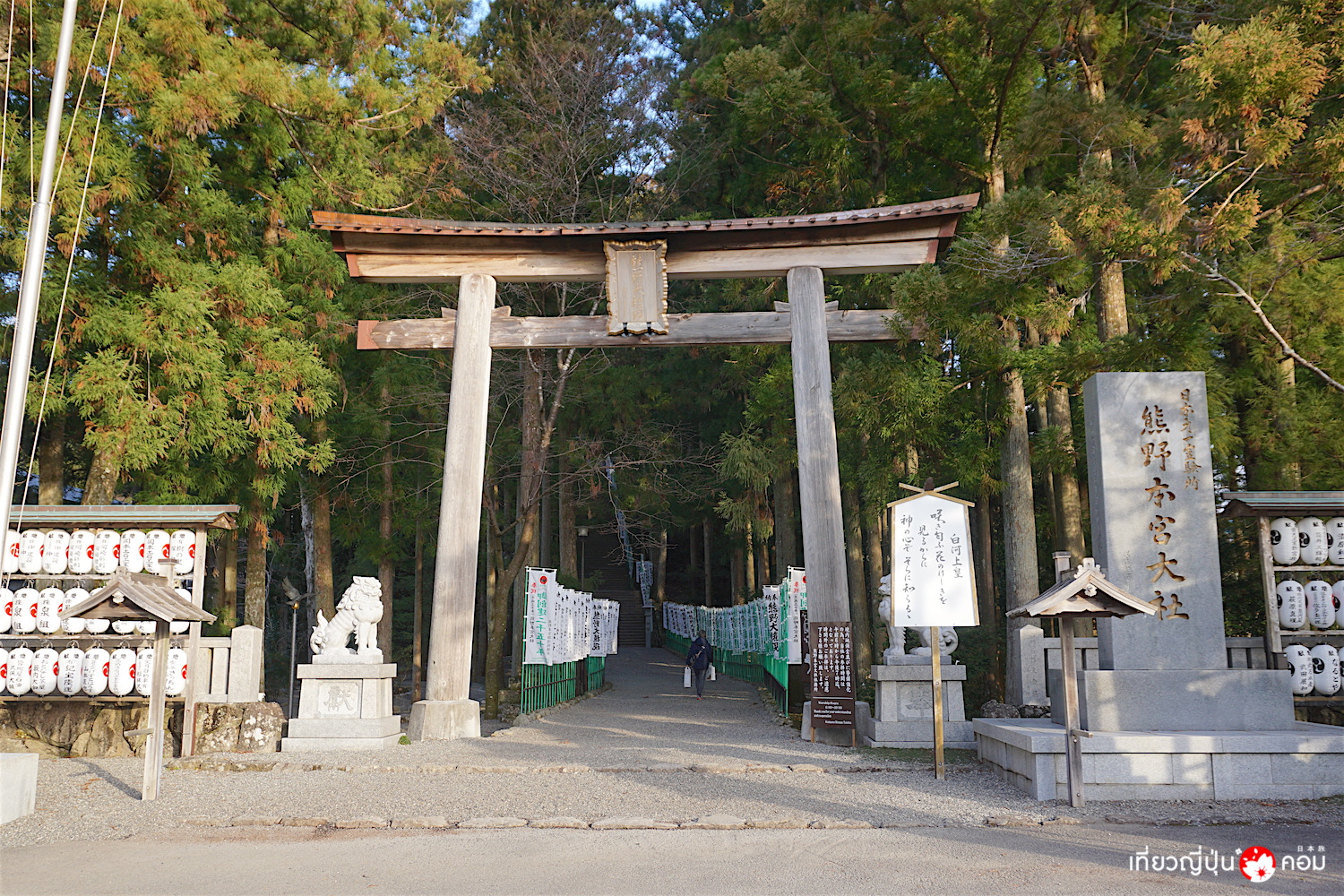 การเดินทาง: จากสถานี Shirahama โดยสารรถบัสมาลงที่ป้าย Hongu-Taisha-mae 本宮大社前 ใช้เวลา 1 ชั่วโมง 20 นาที ดูตารางรถบัส >> ที่นี่